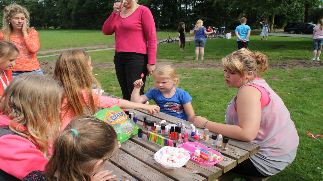 Spelletjes, gezelligheid en make-up. Dat waren een paar ingrediënten van de slotmiddag van de majorettegroep van Drumband de Marko’s. Terwijl het zonnetje vrolijk scheen vermaakten de majorettes zich met snoephappen, balspelletjes en de trampoline.