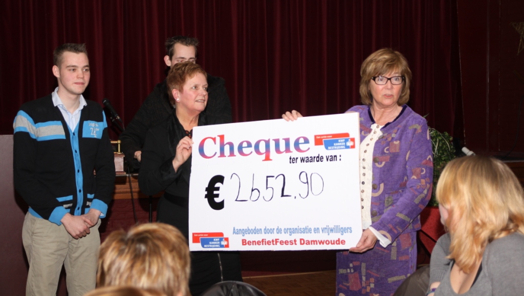 Afgelopen zaterdagmiddag in de Kruisweg te Damwâld was er voor vrijwilligers van het benefietfeest en genodigden een prachtige afsluiting, het bekend maken en overhandigen van het bedrag. Het benefietfeest dat gehouden werd te Damwâld op 28 oktober 2011. De opbrengst van het benefietfeest gaat naar KWF kankerbestrijding.