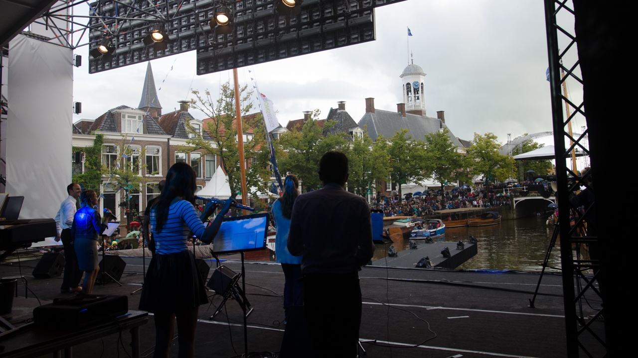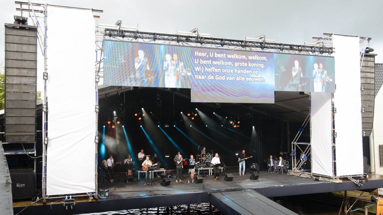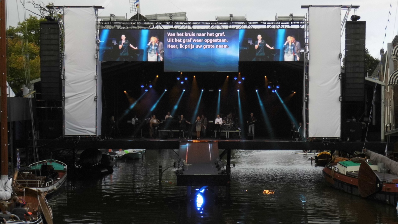 Dominee Ton van der Wekken, dominee Herman de Vries en pastoor Paul Verheijen leidden de openluchtdienst vanaf het podium in het Kleindiep. Onder de noemer ‘Dokkum Zingt!’ passeerden kerkelijke liederen vanuit alle stromingen de revue.