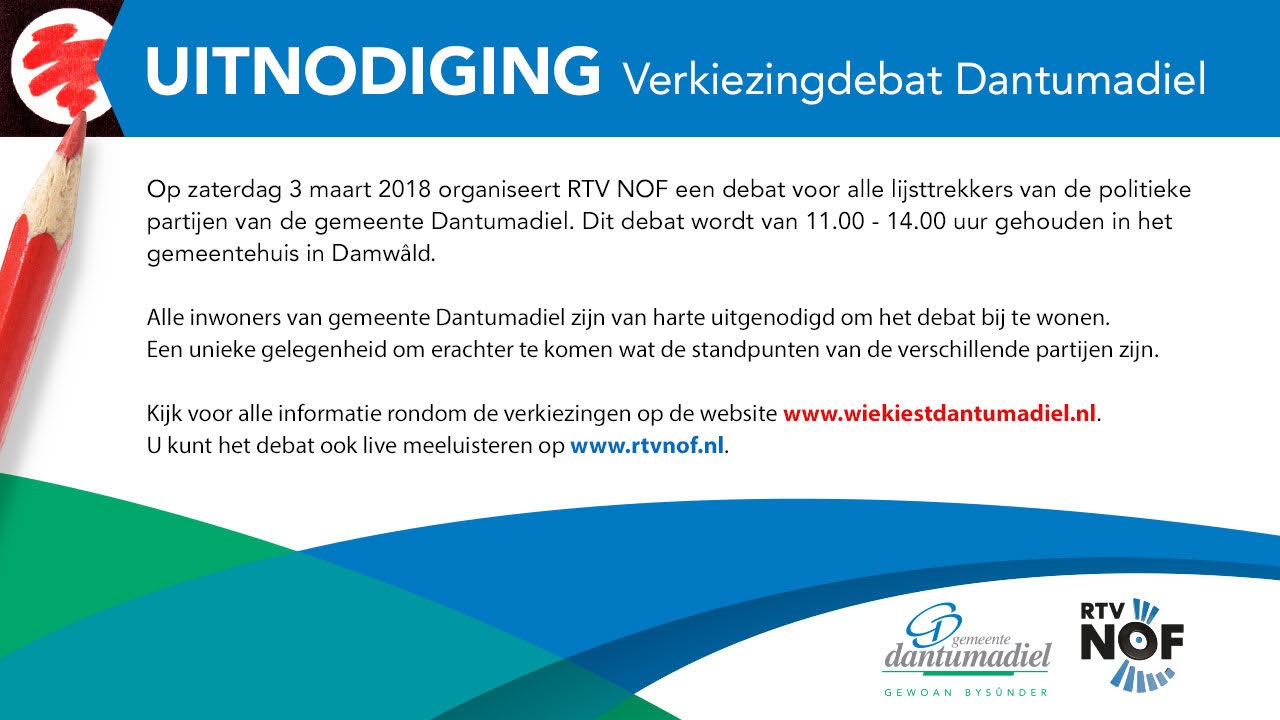 Op zaterdag 3 maart is het lijsttrekkersdebat voor alle lijsttrekkers van de politieke partijen van de gemeente Dantumadiel. Dit debat wordt gehouden in het gemeentehuis in Damwâld en is live te volgen op streekomroep RTV NOF.