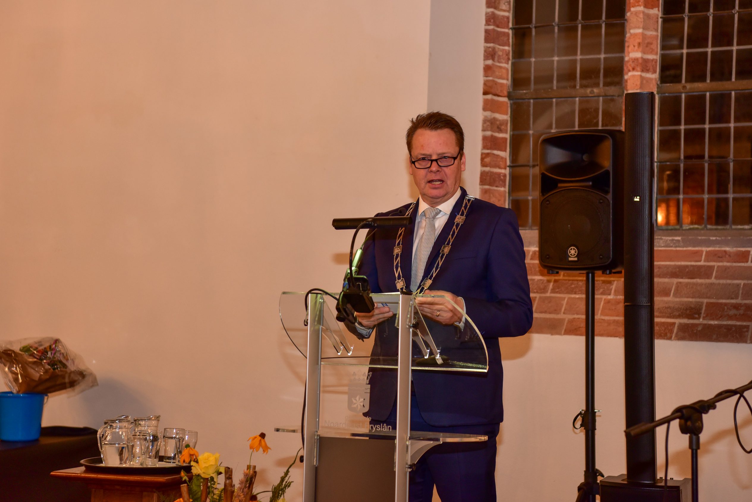 Ik wit net wannear’t der in nij regear is, of dat der überhaupt wol komt dit jier en dat betsjut dat wy net op Den Haag wachtsje kinne. Wy moatte útgean fan eigen krêft. En dêrom is it ek sa goed dat wy inoar hjir moetsje. Want der bin yn dit jier nei hjoed noch 355 dagen oer, 355 dagen om mei inoar te oerlizzen, te kedizen en de swetten út te lizzen. Om plannen te meitsjen, om ús gemeente noch oantrekliker te meitsjen foar nije ynwenners, ús bedriuwen foar nije wurknimmers en ús stêd en doarpen noch oantrekliker te meitsjen foar elkenien. En as ik jim sa foar my sjoch dan sjoch ik dat dy ferbining der is. En dat jout hoop, moed en krêft om mei syn allen ek dy kommende 355 dagen dy’t we noch hawwe yn dit jier der ferbiningsfol foar te gean.