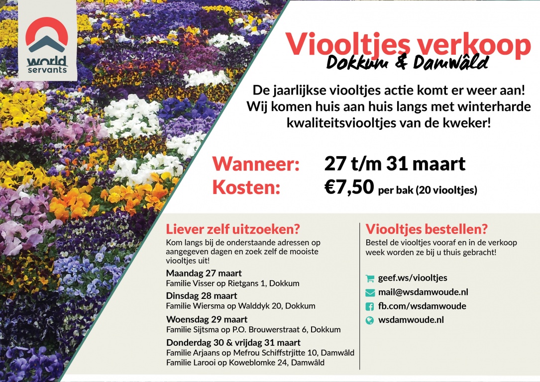 De World Servants viooltjes actie is een actie welke al veel jaren met succes in Dokkum wordt gehouden. In de week van 27 maart tot en met 31 maart zullen World Servants Damwoude en World Servants Dokkum de handen ineen slaan en samen deze actie gaan voeren.