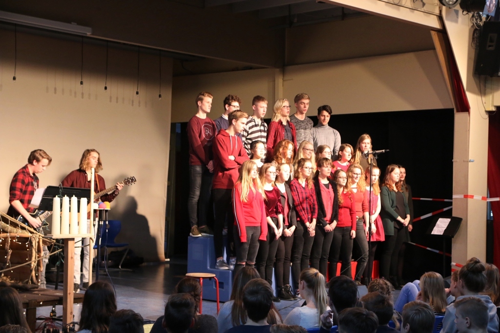 Opvallend was het grote aantal leerlingen wat een actieve rol had in en rond de vieringen. Zo was er een kooractief met een presentatie van bijzondere kerstliederen. Een andere groep liet via een treffend toneelstuk zien welke gedachten er ontstaan als je je zelf de vraag stelt: ‘Voor wie kun jij een lichtpuntje zijn?’