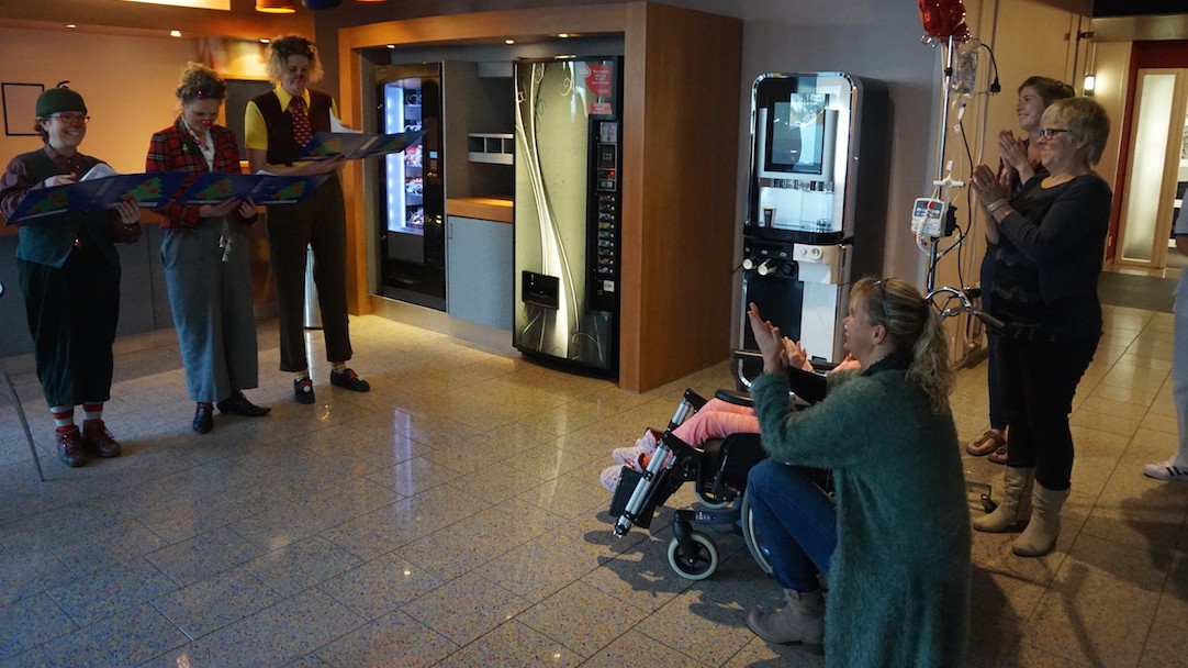 De clowns trokken bekijks van jong en oud. Ook een patiëntje was in de gelegenheid de kinderafdeling te verlaten (zie foto’s) voor het optreden en voorbijgangers bleven even staan om te luisteren. Het was niet de eerste keer dat de clowns op bezoek kwamen in Nij Smellinghe. Eens per twee weken komen er twee CliniClowns naar de kinderafdeling van het Friese ziekenhuis.