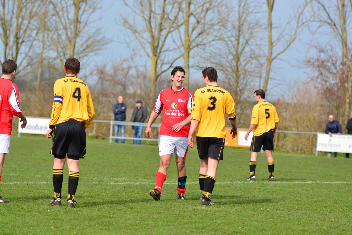 Meteen vanaf het eerste moment is het Ternaard die de aanval zoekt. En meteen duidelijk is dan ook dat Suawoude gaat loeren op de counter. In de eerste helft dan ook enkele kansen voor Ternaard. Arnold Kingma kopt na een prima voorzet van Teake Jan Keegstra hoog over en enkele minuten later trapt Arnold de bal ver naast ondanks dat hij in een kansrijke positie staat. Zo blijft het lang 0-0. Ternaard doet er alles aan om zo snel mogelijk een doelpunt te maken. Een prima corner van Jacob van der Veen wordt hard ingekopt door Wietse Sipma. maar een redding van de keeper van Suawoude doet voorkomen dat Ternaard op voorsprong komt. Maar dan toch in de 31ste minuut de voorsprong voor Ternaard . Een vrije trap vanaf rechts wordt door Jacob van der Veen ingedraaid en omdat niemand de bal raakt gaat de bal via de binnenkant van de paal in het net. Ternaard komt dan ook meer dan verdiend op een 1-0 voorsprong. Keeper Anne Hellinga moest zich een paar maal strekken voor rust, een afgeslagen corner werd prima ingeschoten maar net zo goed gepakt.