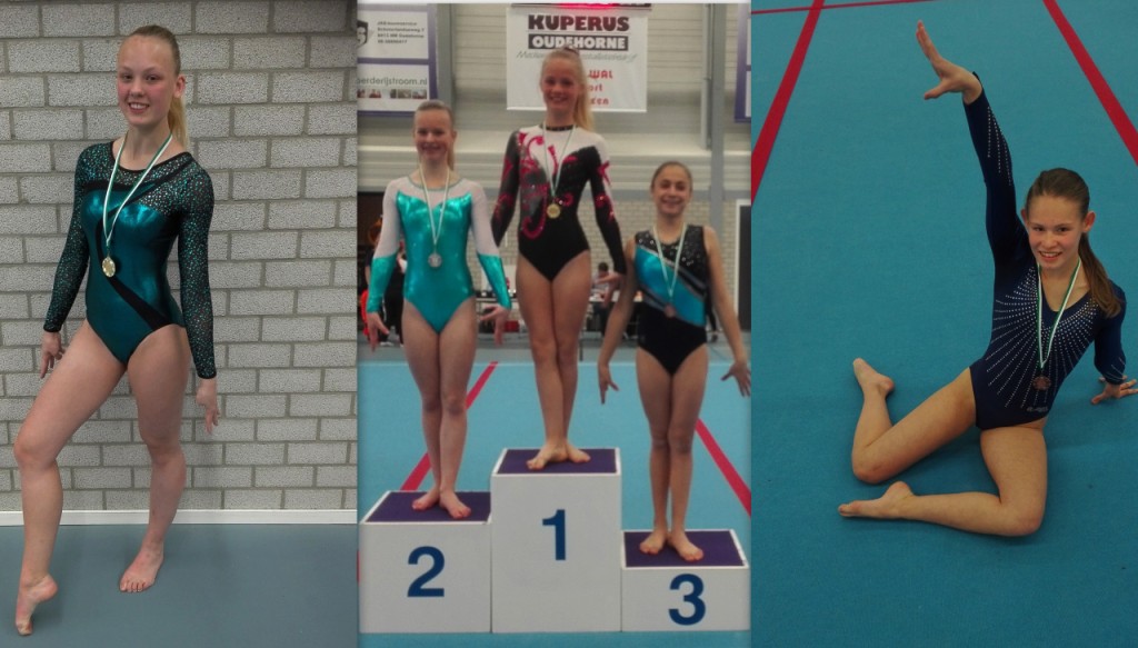Een complete oefening op brug en zelfs met val een derde plek op balk. Ook sprong ze voor het eerst half in half uit. Lieke turnde nog niet strak genoeg om in aanmerking te komen voor een medaille. Kristien Gommers en Sarah van der Meulen turnen in de categorie jeugd E. Kristien begon op vloer met een strakke dans en vooral strakke elementen, hierop werd ze dan ook eerste. Sprong is niet zo haar onderdeel en daar zijn dan ook nog punten te behalen. Voor vandaag waren haar oefeningen genoeg voor een zilveren medaille (tweede plek). Sarah had wat schoonheidsfoutjes op vloer en ook sprong ging bij haar niet zoals ze het graag wil. Echter ging balk super goed en hierop behaalde ze dan ook een eerste plaats. Alle oefeningen samen waren voor haar goed voor een derde plaats.