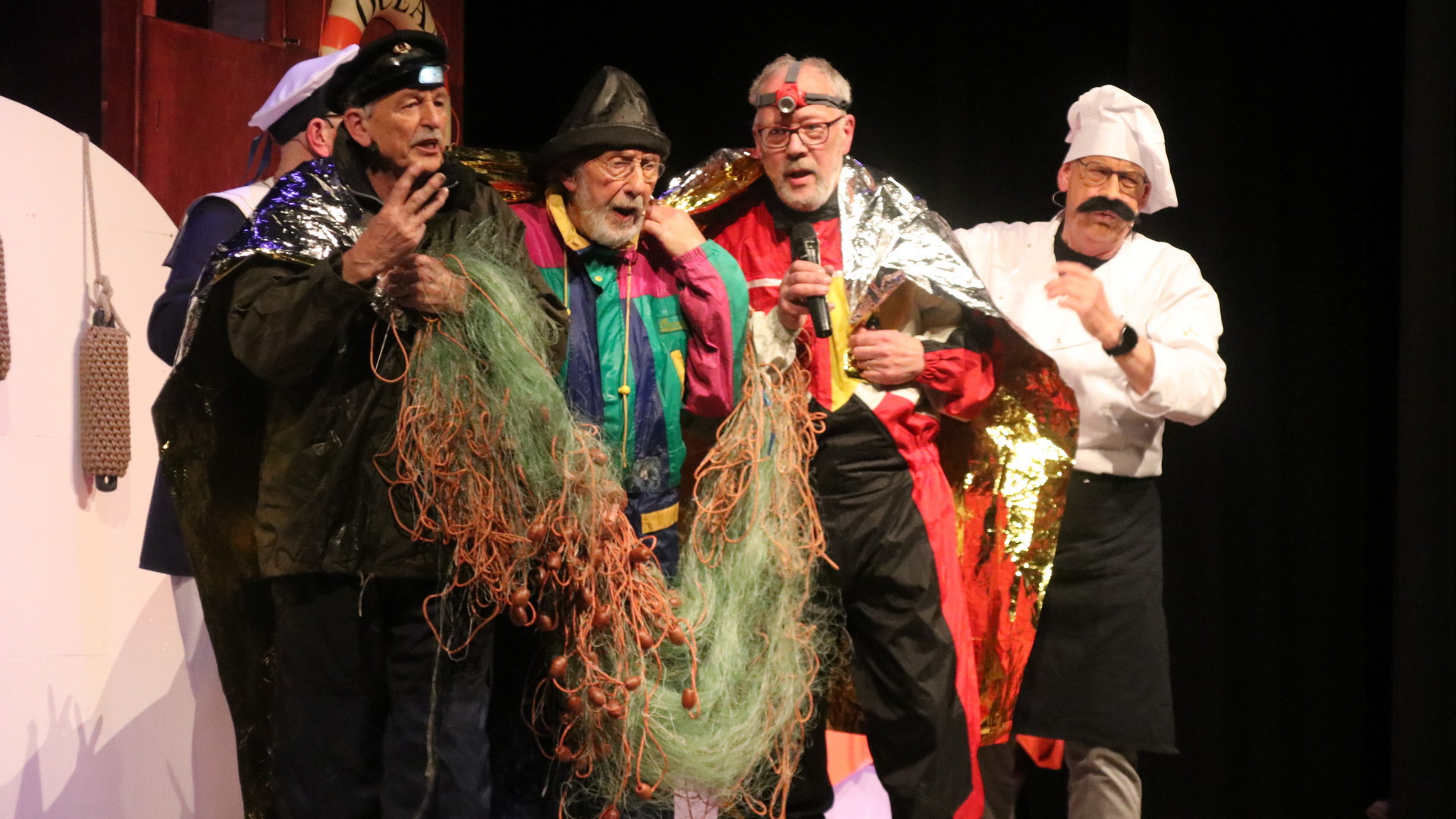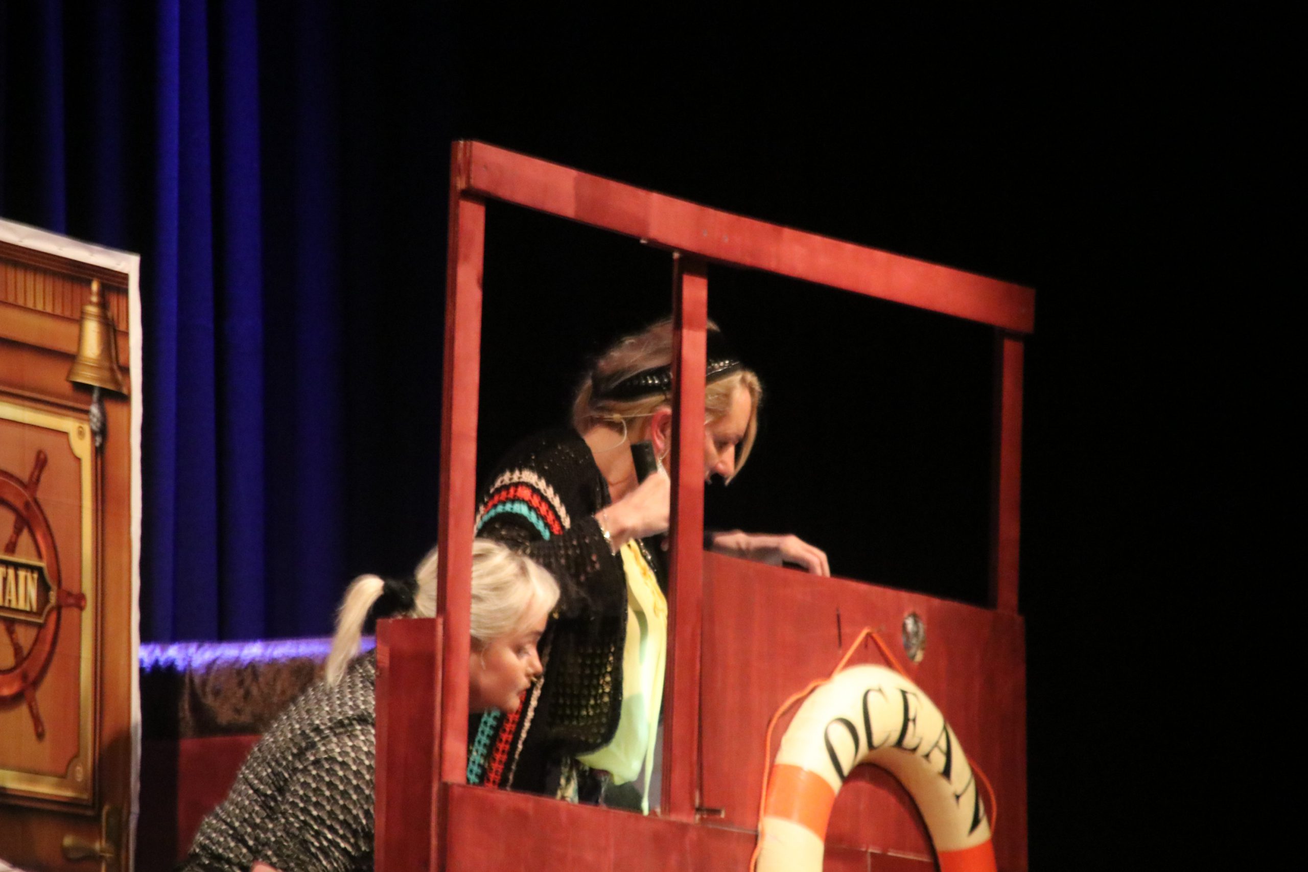 Het verhaal op het podium ging natuurlijk verder en kwam uit bij 2 verstekelingen die verstopt in de reddingssloep aan boord zaten. Deze verstekelingen, Antonia en Rita werden respectievelijk gespeeld door Anita Braam en Rita Looij. Dat deze dames later ook zouden zingen verhoogde het muzikale gehalte zeker. De verstekelingen bleken ook eten en (vooral) wijn te stelen uit de magazijnen en de keuken. Ze wilden gewoon een beter leven. De Duits/Italiaanse kok, een erg mooie rol van Wieger Elgersma, was er niet blij mee. Wel gebeurde er nog iets ‘ergs’. Op een nacht had de Ocean Liner een aanvaring met een vissersschip. De 3 bemanningsleden van het vissersschip: Henk, Teake en Roelof werden gered en kwamen gastvrij aan boord van het cruise schip. Een warm welkom al vonden de beide matrozen deze heren erg stinken, en ja dat werd prachtig uitgebeeld.