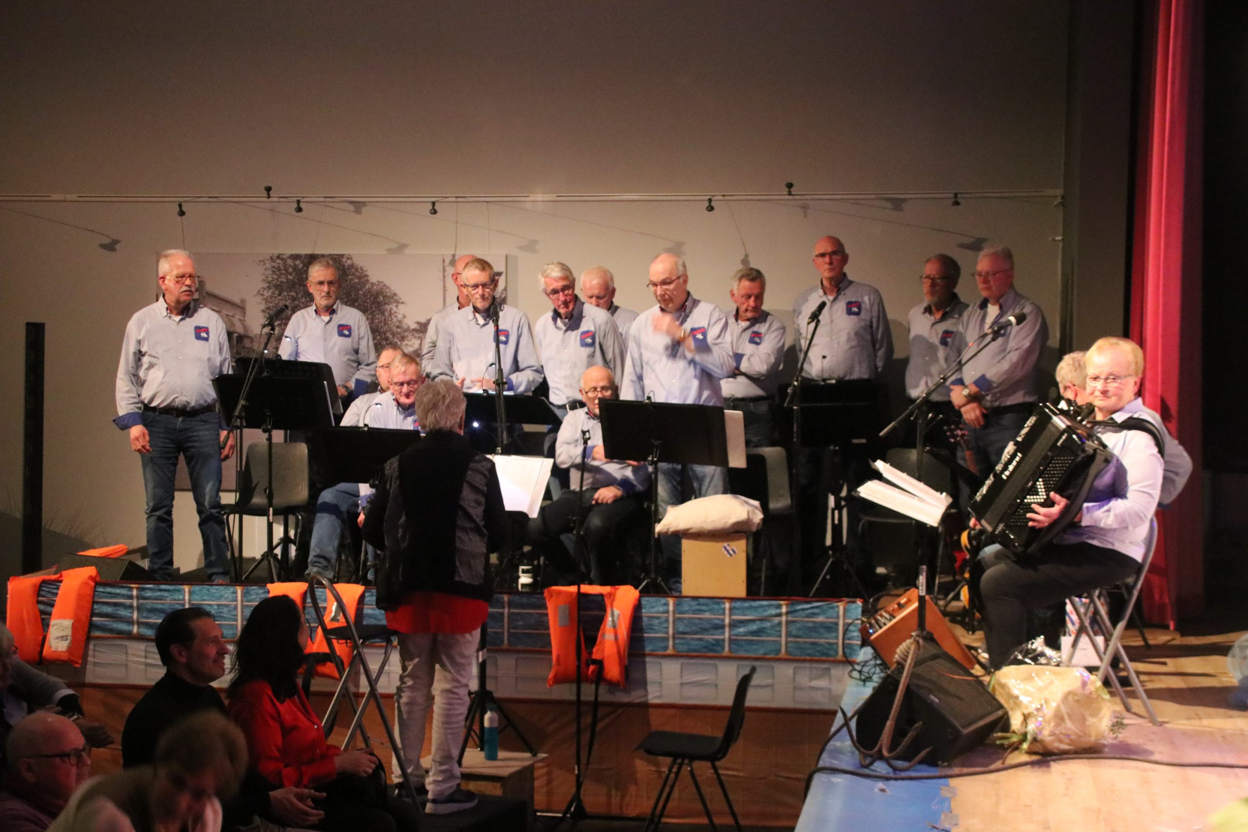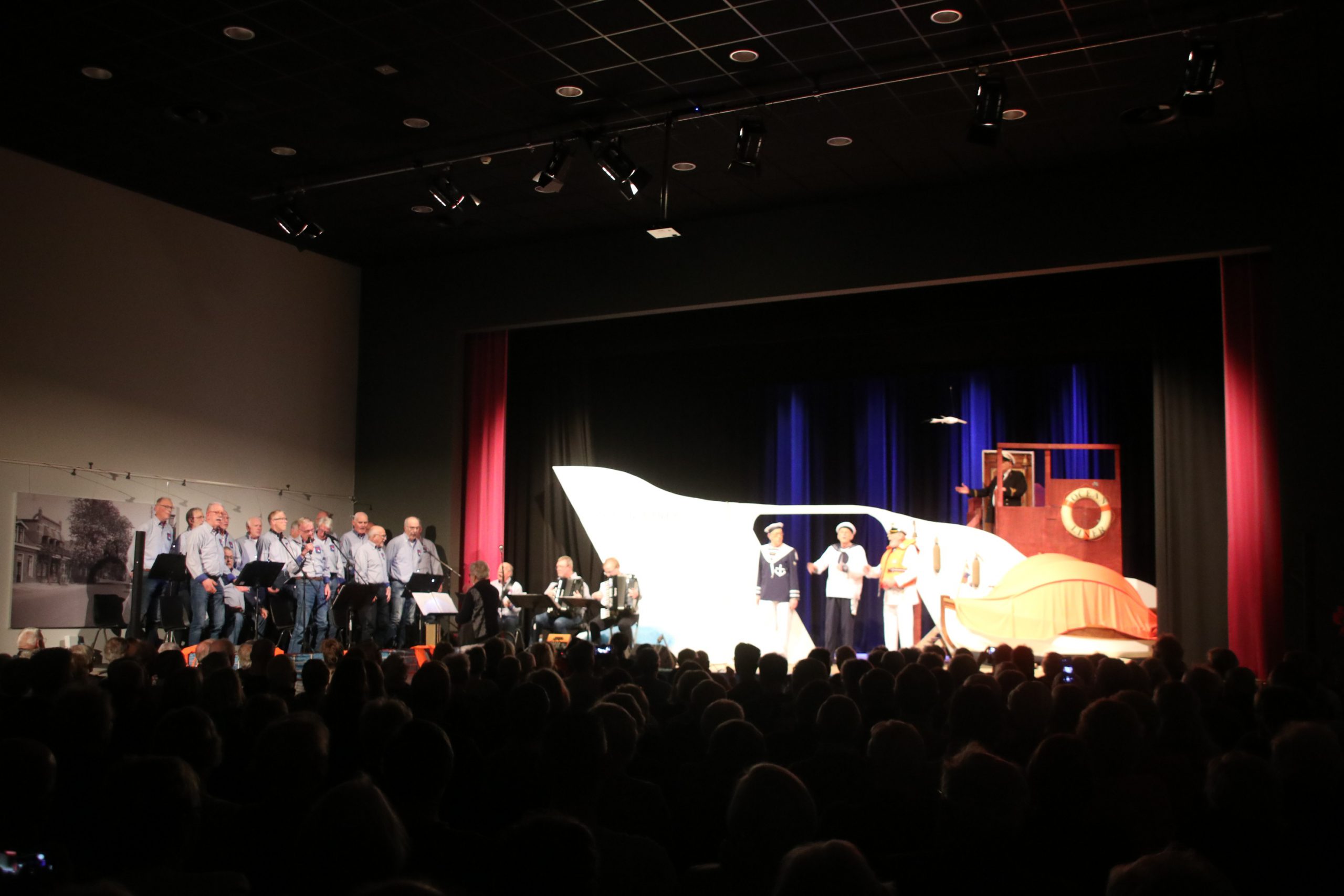 Stipt 20.00 uur opende de voorzitter van het koor, Jan Pieters, de avond. Hete iedereen welkom en in het bijzonder de bijna 250 passagiers die in de uitverkochte zaal zaten. Ook de andere aanwezigen werden niet vergeten. Het openingslied was speciaal voor deze avond geschreven. Over het ontstaan van het koor en het verdere wel en wee van het 22,5 jaar jonge koor. Nog voor het doek openging was het de purser, erg mooi gespeeld door Teake Zijlstra, die de ‘sloepenrol’ ging doen met de passagiers. Bijzonder detail, voor de eerste klasse passagiers een echt zwemvest en de rest? Gewoon simpele zwembandjes. De matrozen Piet Smilda en Henk Hoekstra demonstreerden deze zwembandjes prima.