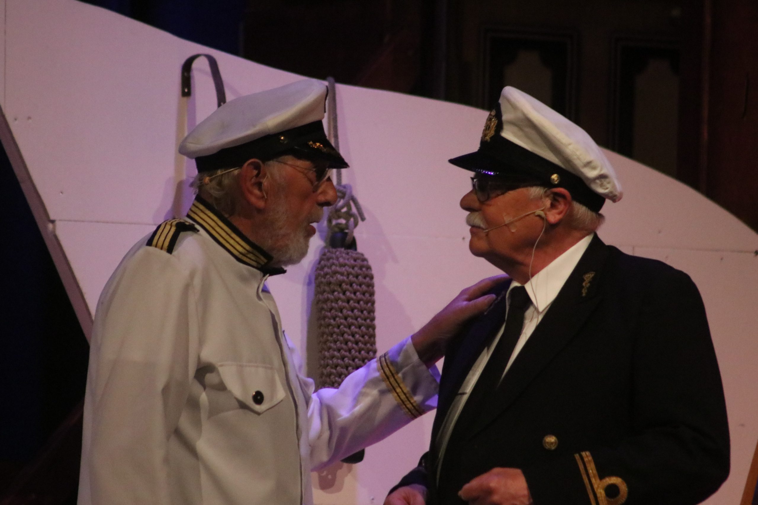 Als dan het doek opengaat staat daar de kapitein van De Ocean Liner, Sytse Giezen statig gekleed in een echt kapiteins pak met de 2 matrozen. Een rol die deze ‘jongemannen’ echt geweldig speelden. De kapitein bleek achteraf ook een ‘vies’ spelletje te spelen. Lage lonen voor de bemanning en flinke bonussen voor hem zelf. Tussendoor zong natuurlijk het koor ook, onder leiding van bootsvrouw/dirigente Gebbien Braam was ook die echt uitstekend verzorgd. Liederen die nieuw en anderen die zeer bekend waren. Aan Lager Wal en in dit geval cruiseschip De Ocean Liner beschikt ook over een erg goed (scheeps)orkest. Roelie Boekema en Koos van Kampen op accordeon en gitarist én solo zanger Jaap Wagenaar. Dit 3-tal heeft versterking van Paul Achterberg op de Cagon.
