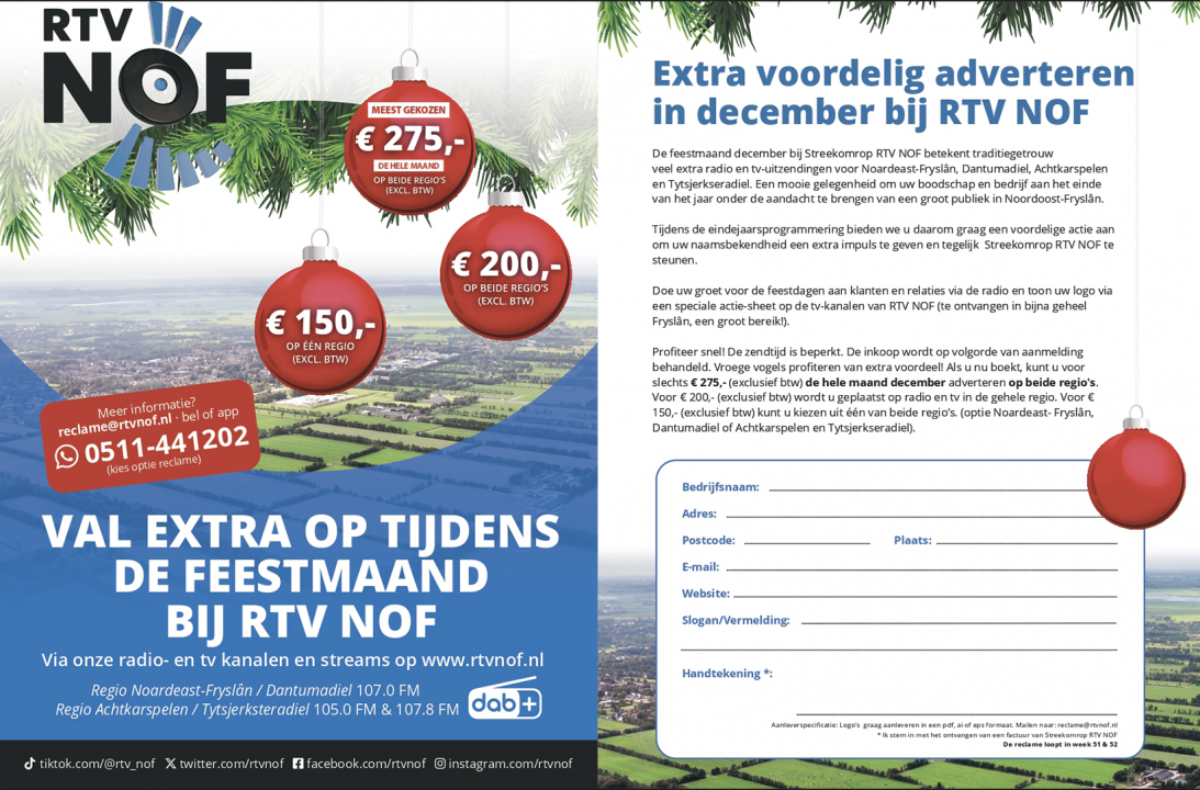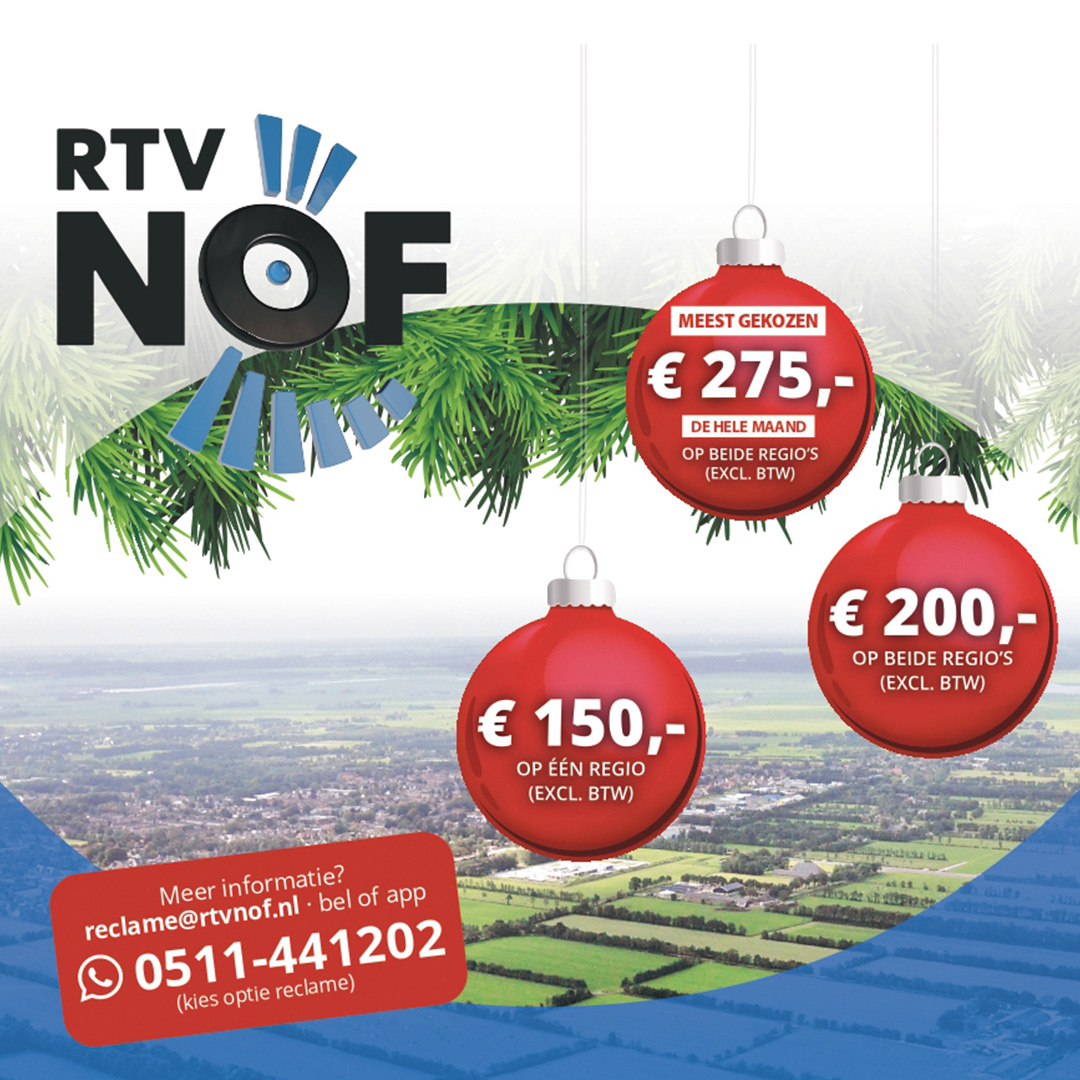 DE WESTEREEN/BURGUM – De feestmaand december bij Streekomroep RTV NOF staat in het teken van extra radio- en tv-uitzendingen voor Noardeast-Fryslân, Dantumadiel, Achtkarspelen en Tytsjerksteradiel, wat een uitstekende kans biedt om uw boodschap aan een groot publiek te presenteren.