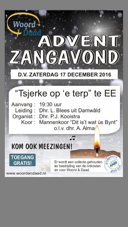 Zaterdag 17 december is er een Adventzangavond “Tsjerke op ‘e terp” te Ee, aanvang 19.30 uur Toegang: gratis