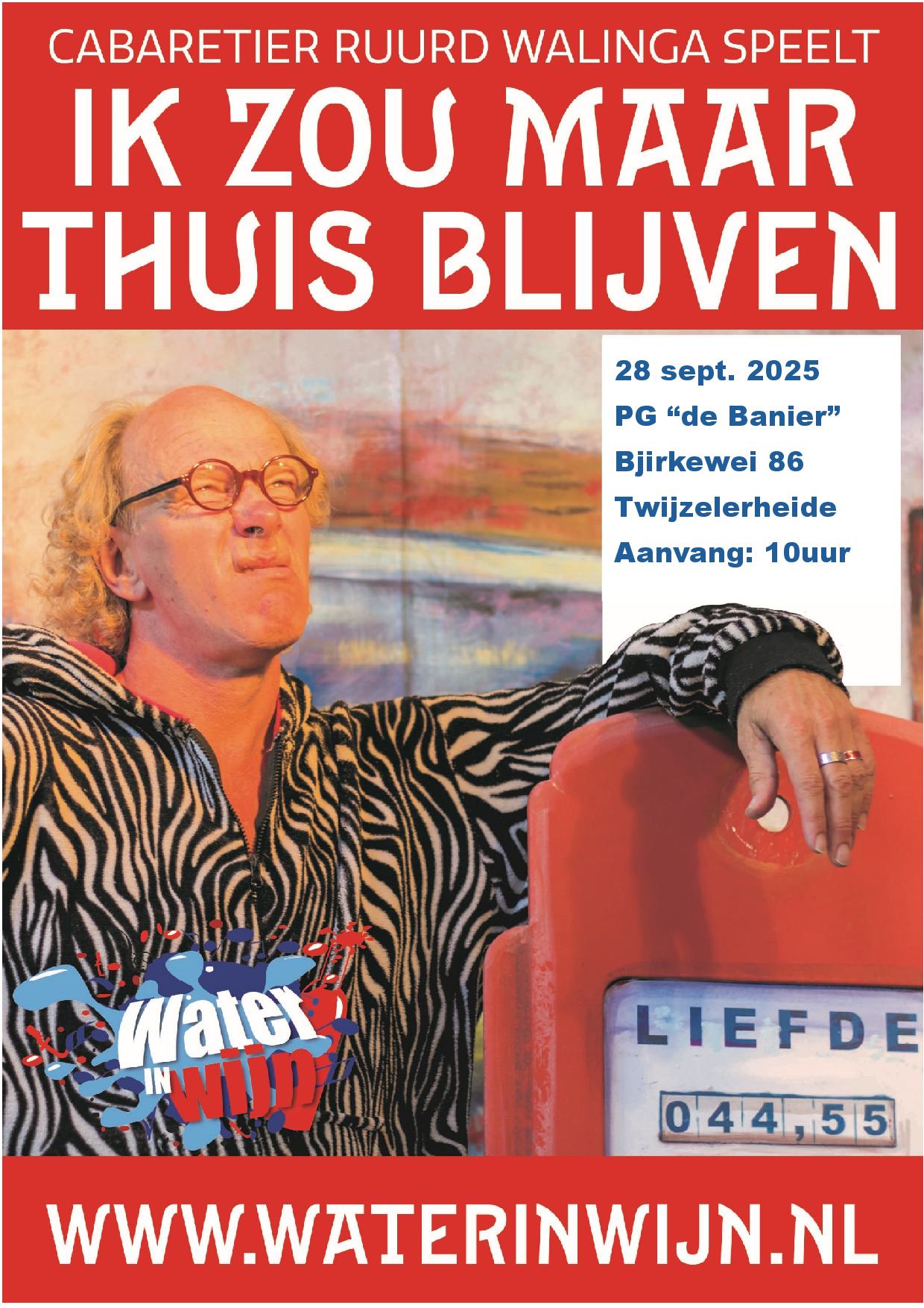 TWIJZELERHEIDE – Geen dominee die de dienst leidt, maar een cabaretier. Dat gebeurt op zondagmorgen 28 september in de protestantse gemeente, “de Banier” aan de Bjirkewei 86 in Twijzelerheide. Christelijk cabaretier Ruurd Walinga uit het Gelderse Geesteren verzorgt de dienst met zijn voorstelling ‘Ik zou maar thuis blijven’.