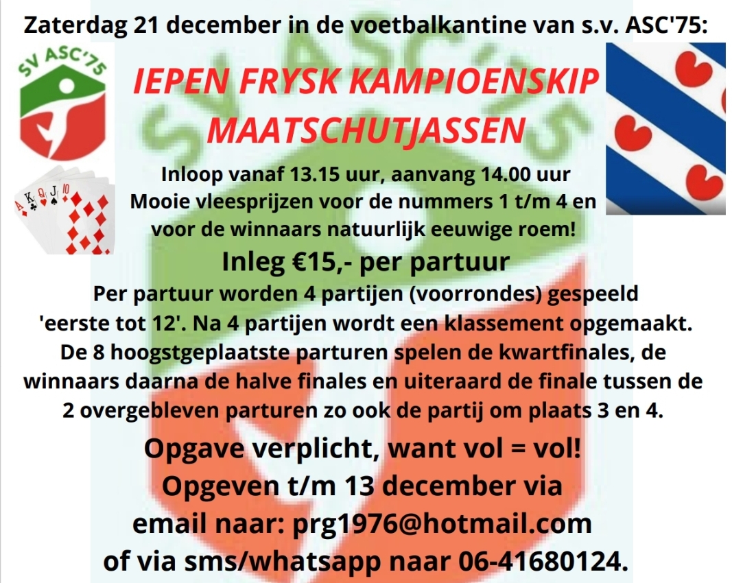 AUGUSTINUSGA – Dit jaar de 1e editie van het open Fries kampioenschap maatschutjassen bij s.v. ASC’75. Al jaren is het WK maatschutjassen in Warga een begrip.