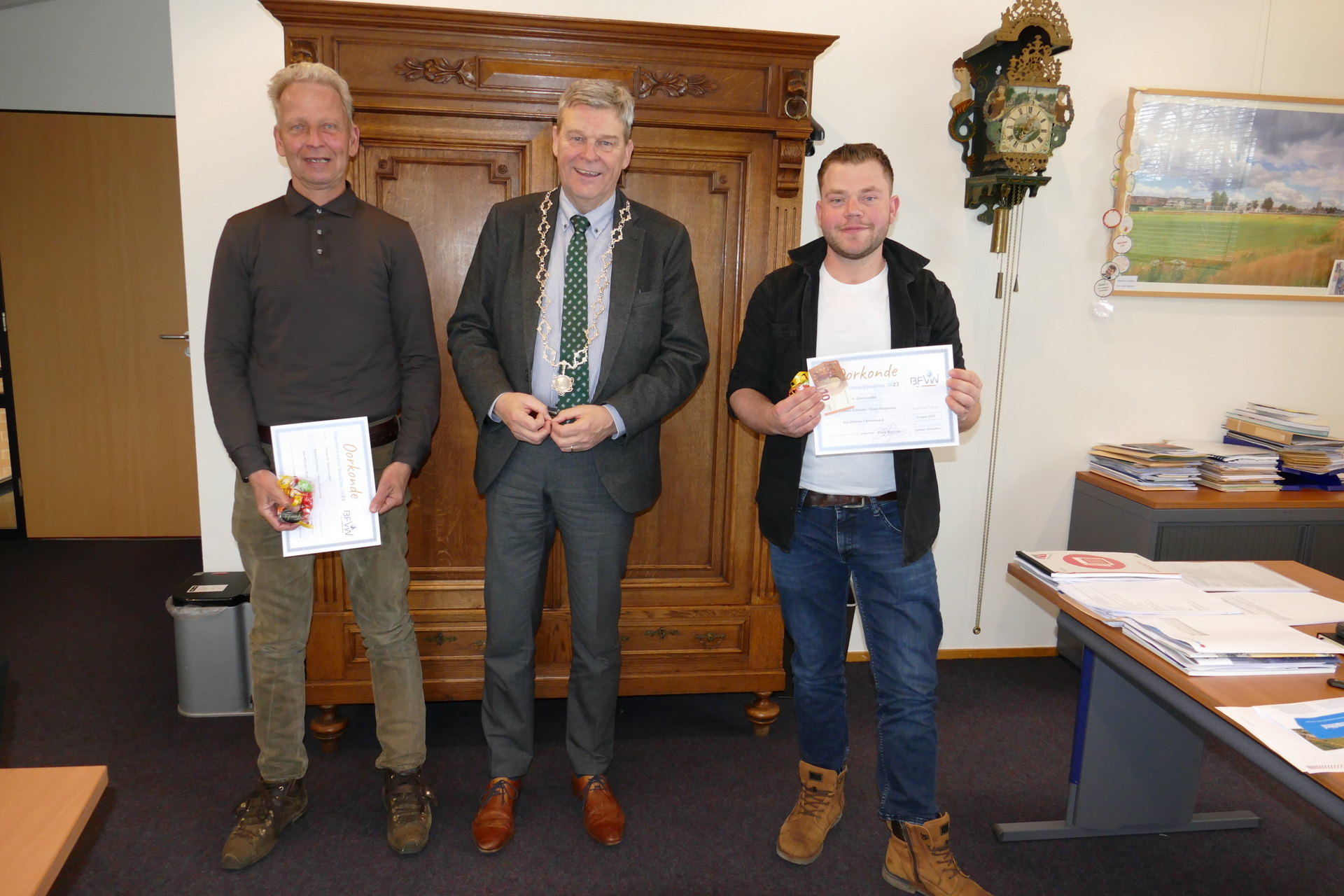 Het ei lag nog net in de gemeente Dantumadiel. Burgemeester Klaas Agricola overhandigde woensdagmiddag de beide heren het vindersloon met een oorkonde. Ewout en Klaas hebben het vindersloon geschonken aan de Vogelwacht van Ikkerwâld.