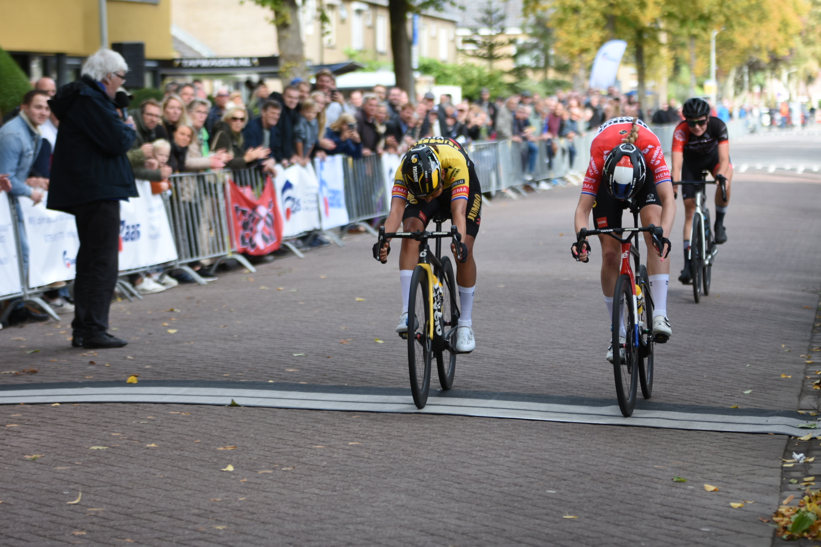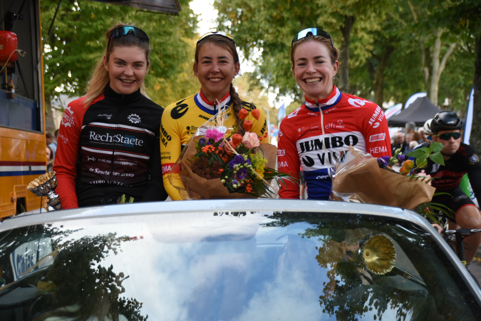 In Assendelft trok Anouska voor het laatst het Jumbo Visma tenue aan in een koers. Dat wilde de Westereense niet zomaar voorbij laten gaan en dus gaf ze nog een keer alles in het geel-zwart. Anouska reed lange tijd alleen voorop. Uiteindelijk sloten Rosan Koper en Anouska`s ploeggenote Riejanne Markus nog aan. “Het peloton zat ons echter op de hielen, het gat werd nooit groter dan 15 seconden. We moesten daardoor volle bak blijven rijden, maar hielden het peloton wel achter ons. In een sprint was ik nipt de snelste. Mooi om zo de zege te pakken en samen met Riejanne op het podium te staan in onze laatste koers als ploegmaats”, sprak Anouska na afloop.