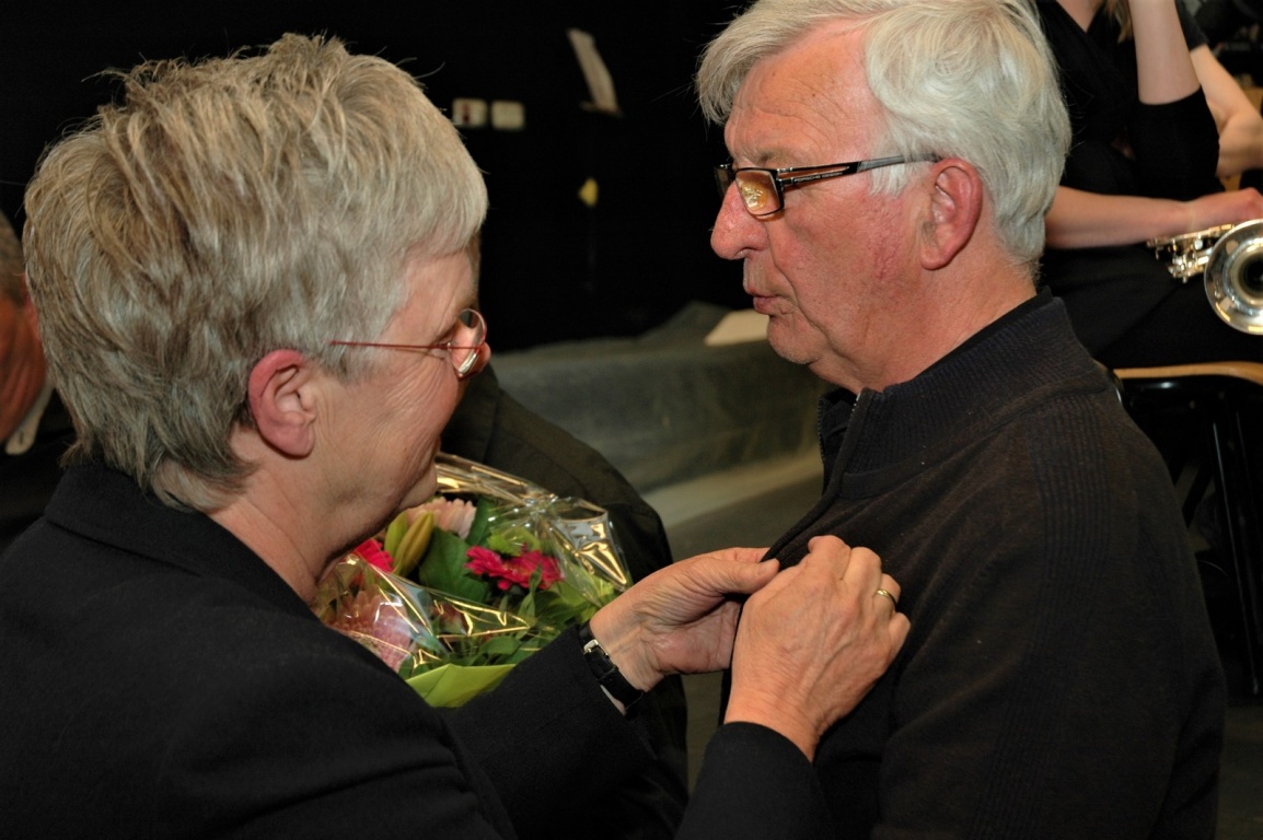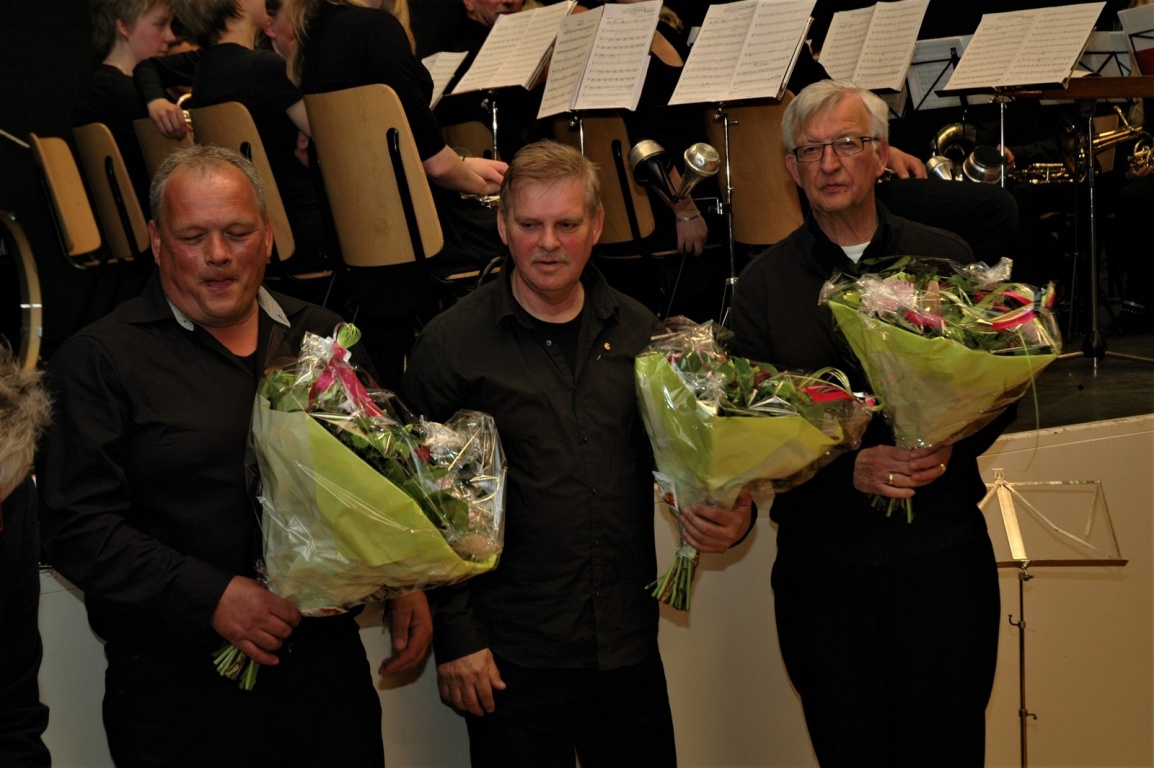 Na het jeugdorkest liet de Bazuin zelf een aantal stukken horen. Na 1 van de laatste stukken werd de microfoon overhandigd aan Aafke Poelstra, van de organisatie van muziekverenigingen in Fryslan. Zij riep Tiemen de Vries en Melis Bijlstra naar voren. Beide heren zetten zich al 40 jaar in voor de muziekwereld, als muzikant maar ook binnen besturen van verschillende verenigingen. Later werd ook Sape de Vries er bij geroepen, dhr. de Vries spande de kroon met 60 jaar inzet waarvan zo’n 42 jaar bestuurstaken. Mensen als deze 3 mannen zijn de drijvende kracht achter verenigingen. Alle 3 de heren kregen een verhaal over hun rijke carrières te horen en hierna ging mevr. Poelstra over tot het uitreiken van de speldjes en oorkondes. Stralend van oor tot oor namen de mannen hierna weer plaats binnen het orkest.