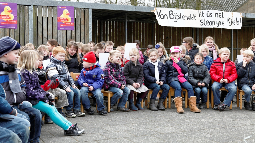 Op basisschool de “Gearing” te Ee werd dinsdag normaal les gegeven. Een half uur voor einde schooltijd zongen de leerkrachten en kinderen uit volle borst de liederen die gericht waren aan het adres van minister Bijsterveldt. Zij heeft plannen om drastisch te bezuinigen in het onderwijs.