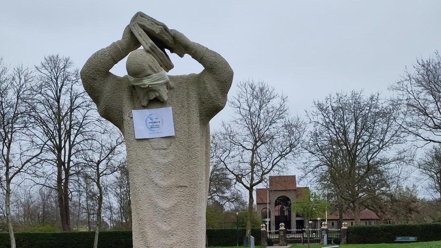 DOKKUM – Het beeld van Bonifatius in Dokkum is dit weekend geblinddoekt door klimaatactivisten. Op verschillende plaatsen in het land zijn tientallen standbeelden geblinddoekt. Ook het beeld van onder andere Aletta Jacobs in Groningen, koningin Wilhelmina in Utrecht en Apeldoorn werden voorzien van een blinddoek. In Nijmegen, Rotterdam, Lochem en Hardenberg gebeurde dat ook bij beelden.