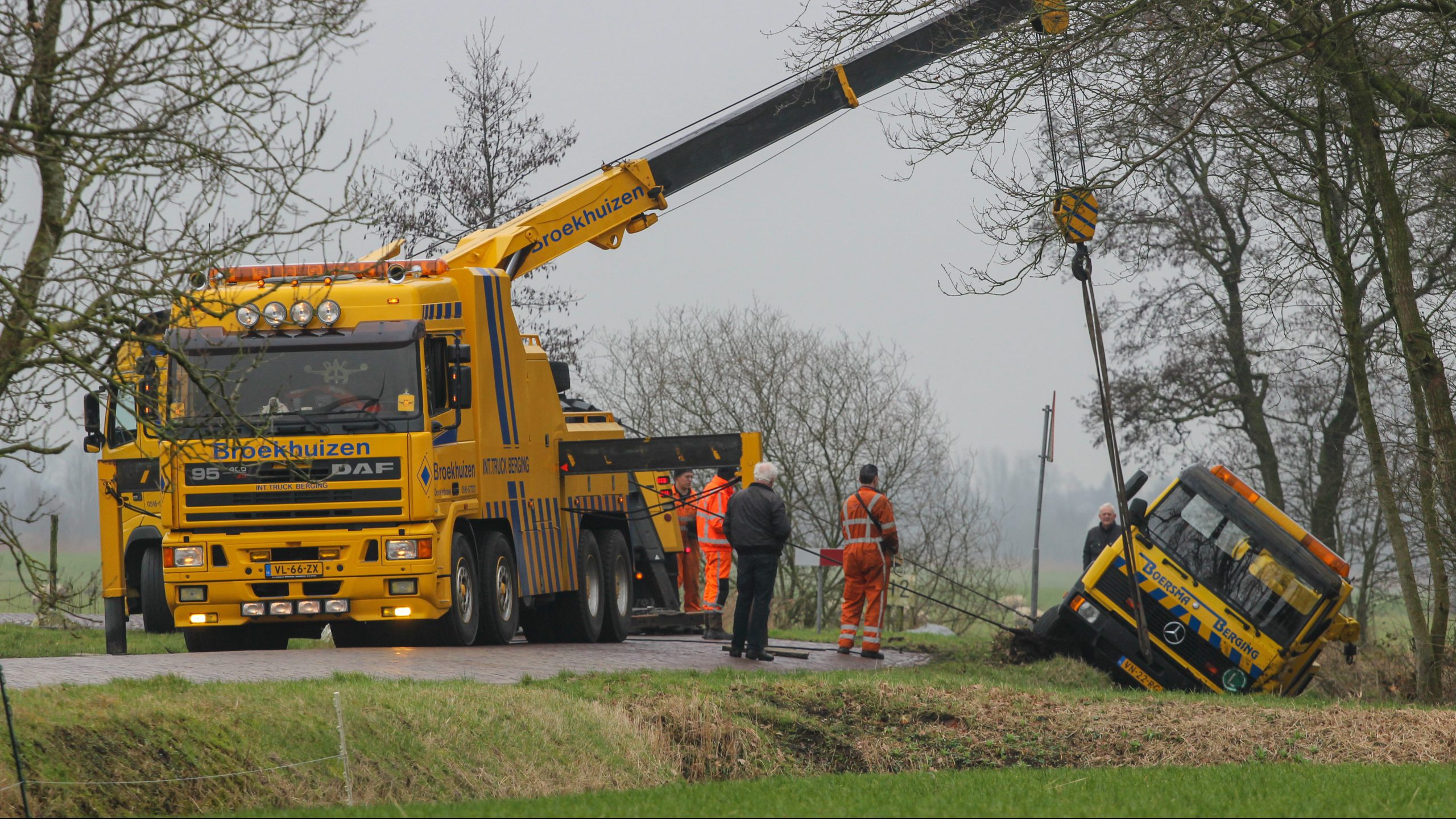 Een berger is woensdagmorgen in de sloot geraakt op de Miedloane tussen De Westereen en Wâlterswâld. Op het moment van het ongeval, had de berger een auto op de sleeplepels. Hoe het ongeval precies kon gebeuren, is nog onbekend….