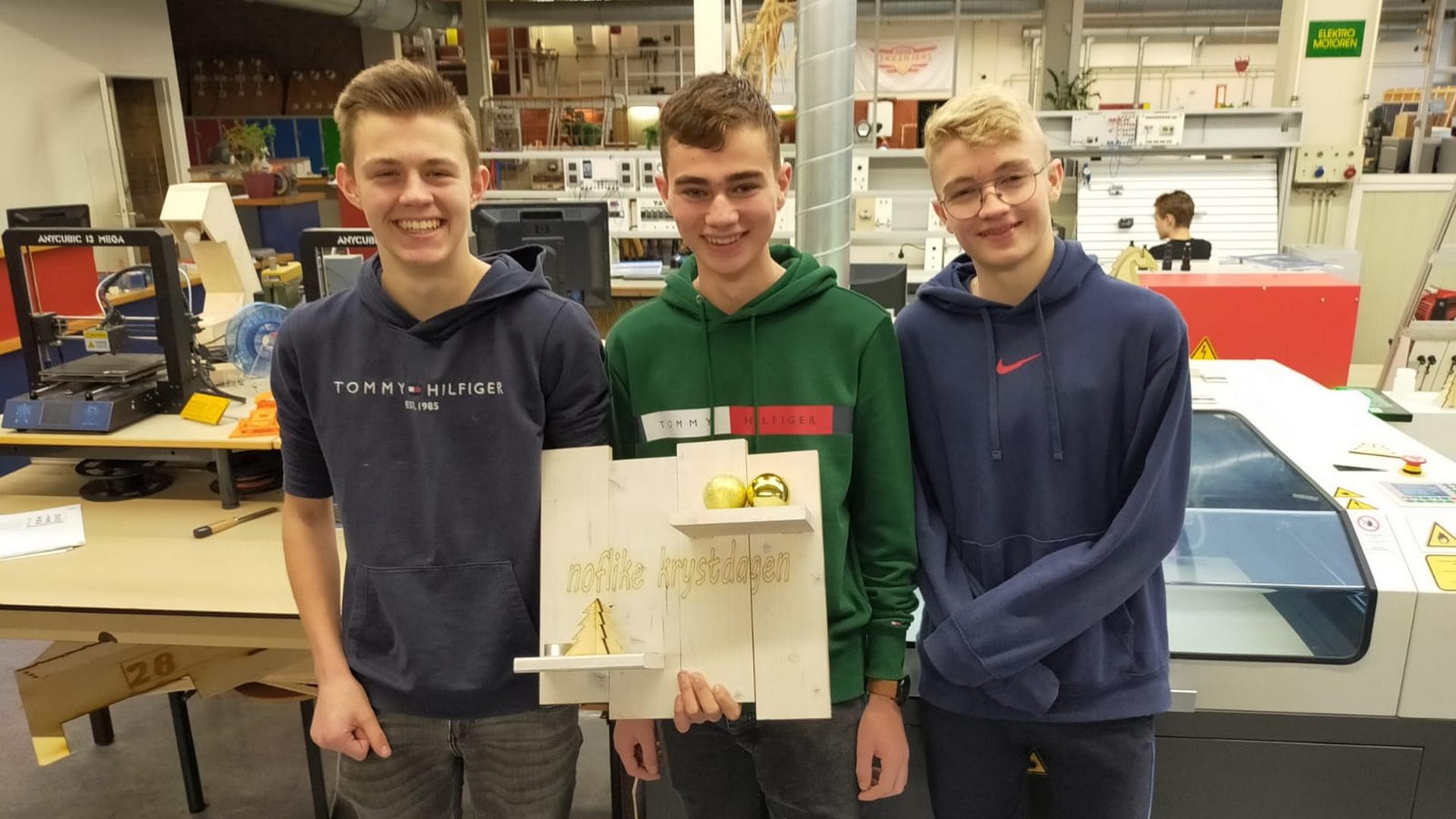 De leerlingen van BWI (Bouwen Wonen Interieur) hebben een wandplank van hout gemaakt en geverfd, de leerlingen van PIE (Produceren Installeren Energie) hebben daar een kerstboodschap in gegraveerd met de laserprinter en hebben een kerstboompje van hout als accessoire gemaakt voor op de wandplank. Leerlingen van ZW (Zorg en Welzijn) hebben prachtige kerstkaarten gemaakt met een geschreven kerstwens. De leerlingen van E&O (Economie en Ondernemen) hebben de attentie feestelijk ingepakt en voorzien van de kerstkaart.