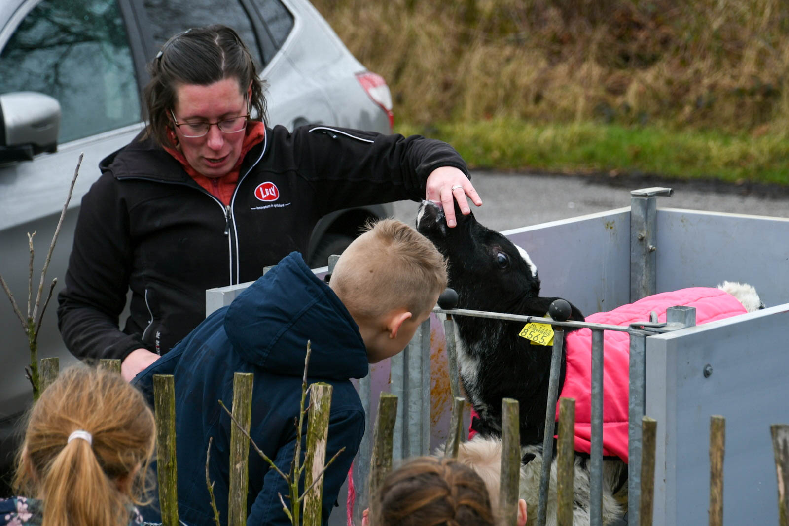Het kalfje is twee weken oud, weegt 45 kilo en drinkt per dag 2 x 3 liter melk. Na afloop hadden de kinderen de naam George Arthur voor het kalfje bedacht. Daarna nog met zijn allen op de foto en hadden de kinderen een zeer geslaagde middag.