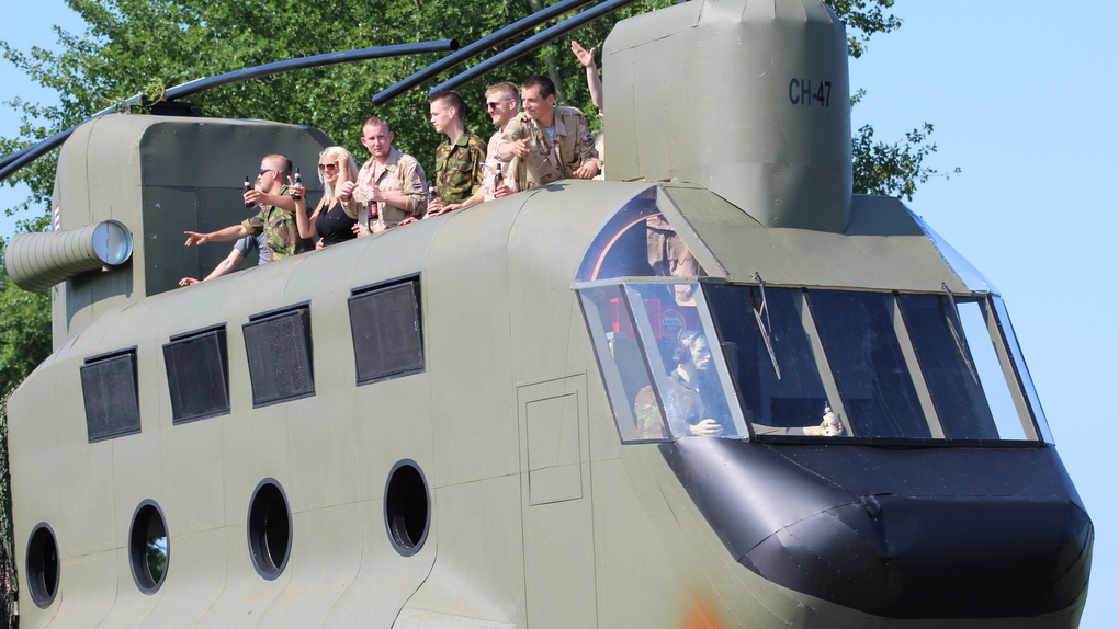 Over de Dokkumer Ee voer zondag een bijzonder transport. Een groep mensen uit Wartena haalde een nagemaakte Chinook-helikopter uit Dokkumer Nieuwe Zeilen om te gebruiken bij het dorpsfeest. In juni reed het ‘gevaarte’ nog mee in de optocht van Morra.