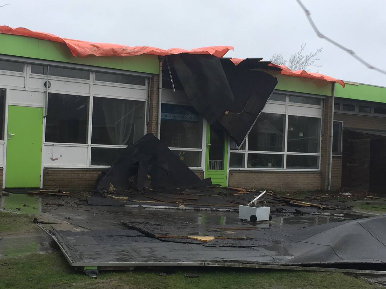 De bitumen dakbedekking lag op het schoolplein. Zondag waren aannemers en de schoolleiding aanwezig om zo snel mogelijk te proberen om het dak te repareren, het dak is tijdelijk met plastic kleden dicht gemaakt.