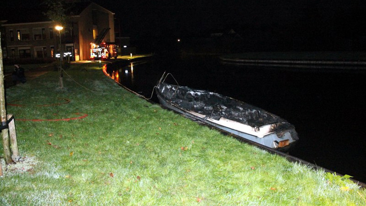 In het parkje achter de Tsjerk Hiddesstraat in Kollum is aan het begin van de nacht van donderdag op vrijdag een bootje compleet verwoest door een brand