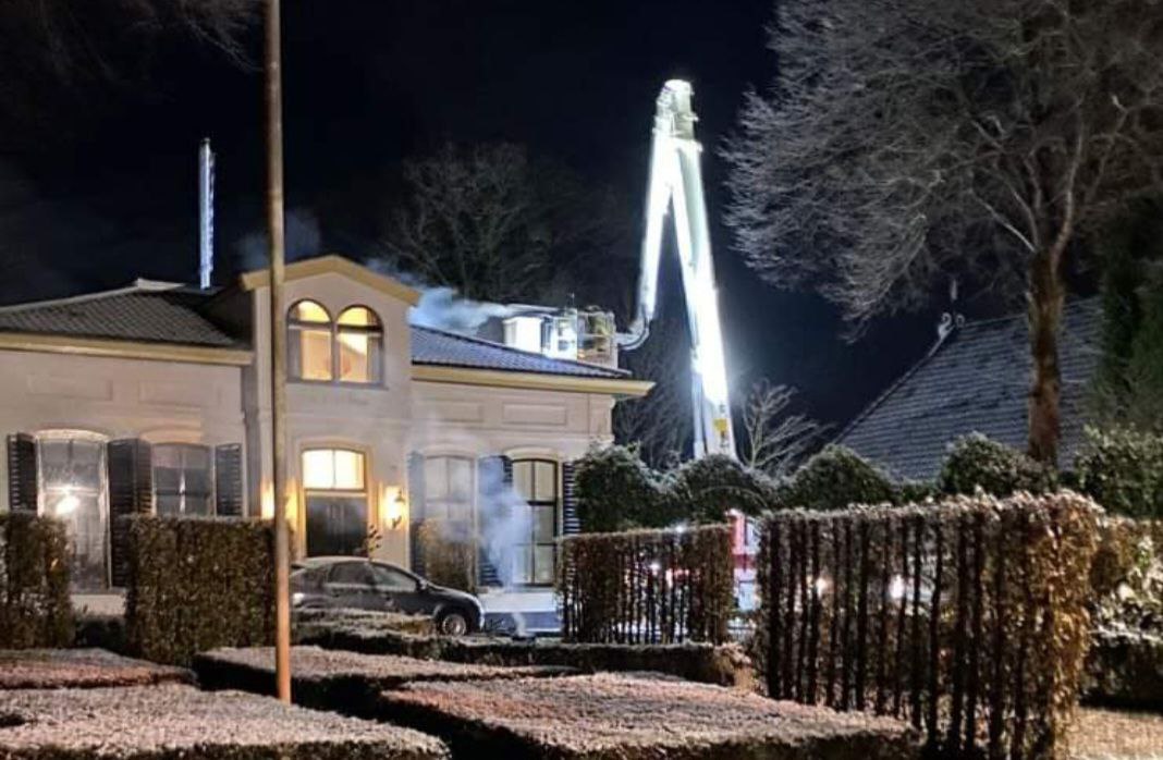 De hoogwerker uit Dokkum werd ook ingeschakeld. De brand bevond zich hoofdzakelijk in de bovenste rand van de kap van de schoorsteen.