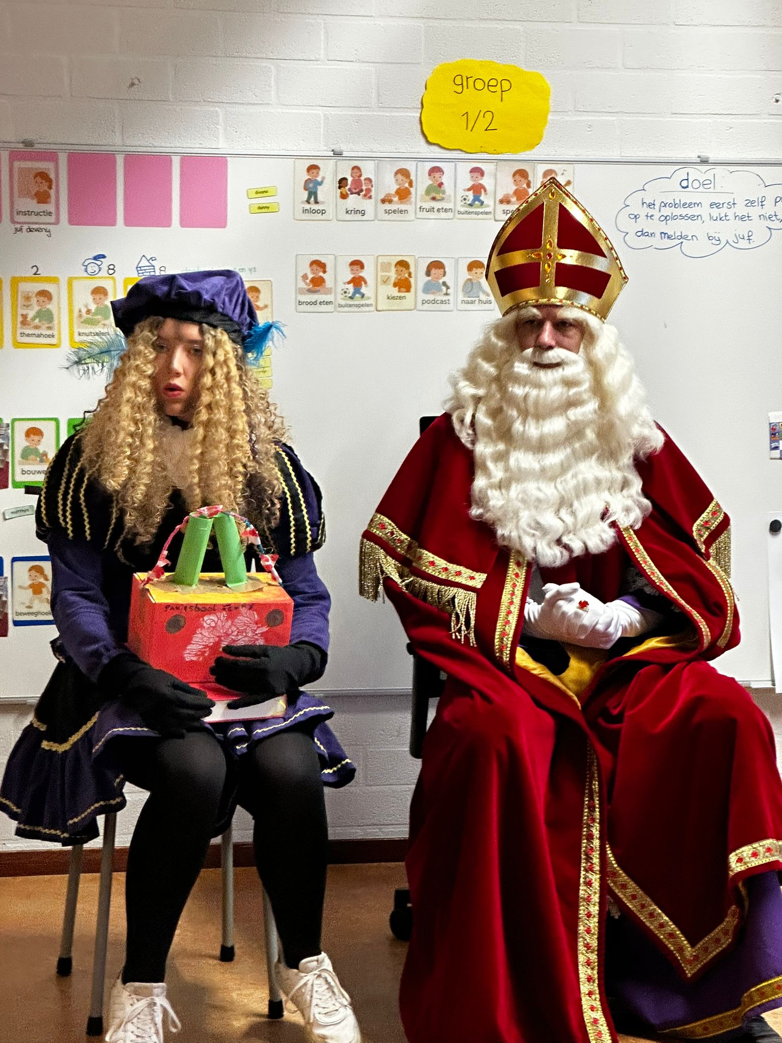 Binnen zong de hele school nog één keer samen voor de Sint. In de klassen genoot Sinterklaas vervolgens van een warme rondgang door de hele school: in groep 1-2-3 kregen alle kinderen persoonlijke aandacht en was vooral de cadeautjeskamer, waar zij zelf in kleine groepjes een cadeau mochten kiezen, een groot succes; in groep 4-5 bewonderde de Sint de prachtige surprises en grappige gedichten waar iedereen enorm zijn best op had gedaan; en in groep 6-7-8 werd hij ontvangen met creatieve surprises, fijne gedichten en zelfs een vrolijk dansoptreden waarbij een enthousiaste Piet gezellig meedanste.