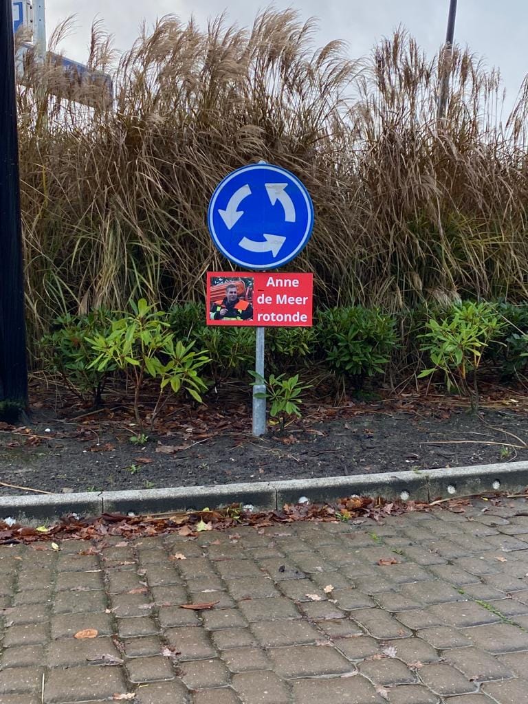 Naast het spandoek is ook rotonde ter hoogte van het gemeentehuis voor een dag omgedoopt tot de “Anne de Meer rotonde”.