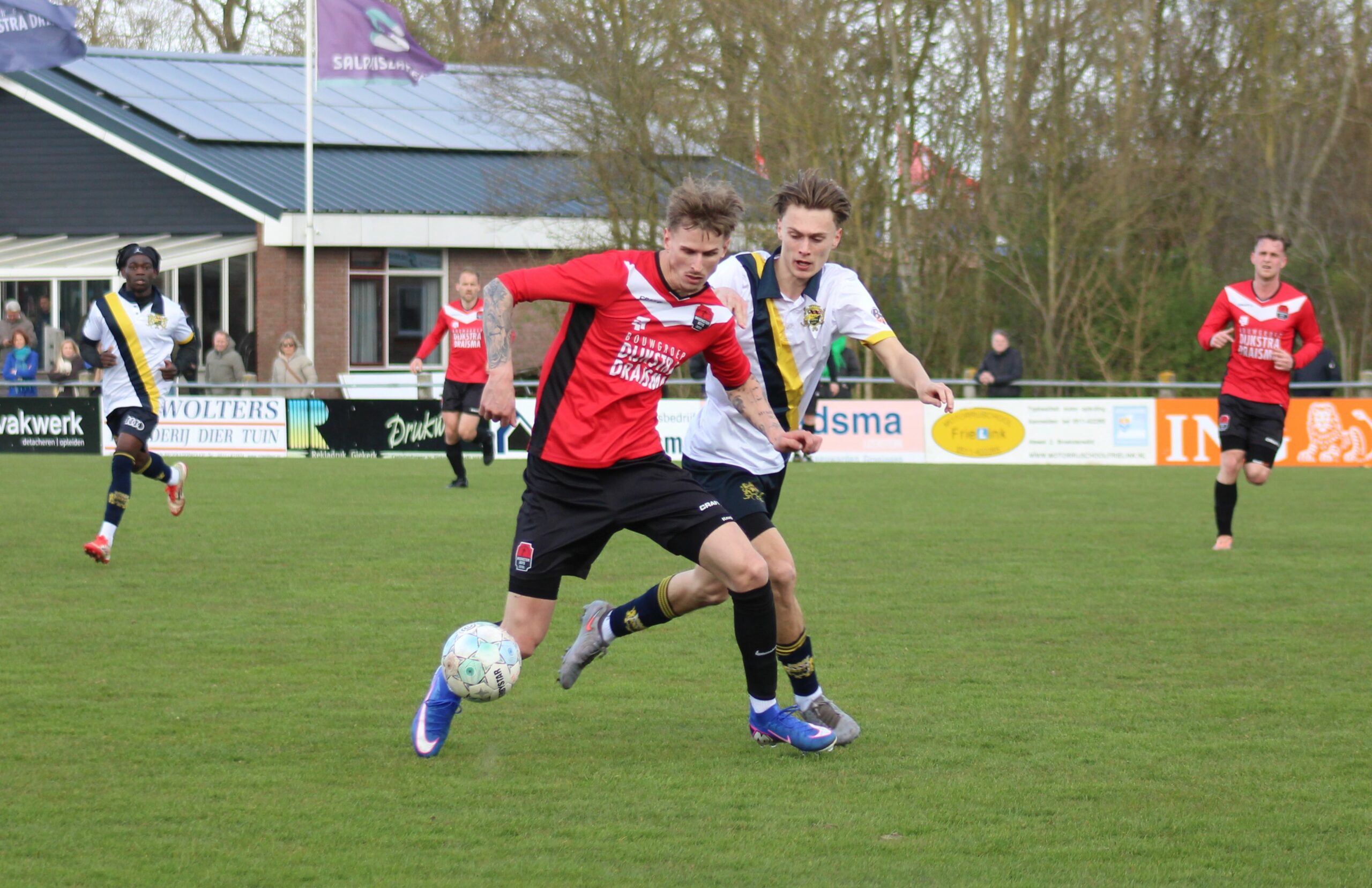 De wedstrijd op het hoofdveld, onder toeziend oog van de massaal opgekomen supporters, was er eentje om je vingers bij af te likken. Een prachtige strijd, twee teams die vol voor de winst gingen, gele en rode kaarten, (afgekeurde) doelpunten, discussie over wel of geen buitenspel en na de winst voor de thuisploeg was er met het feestje in de kantine natuurlijk een prachtige afsluiting.