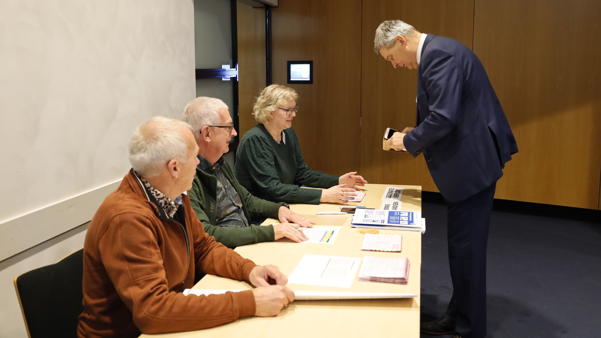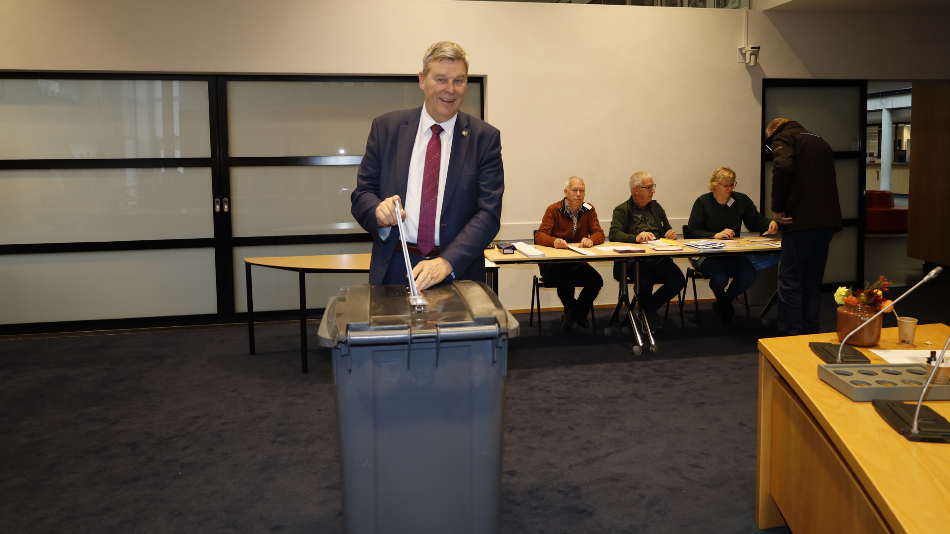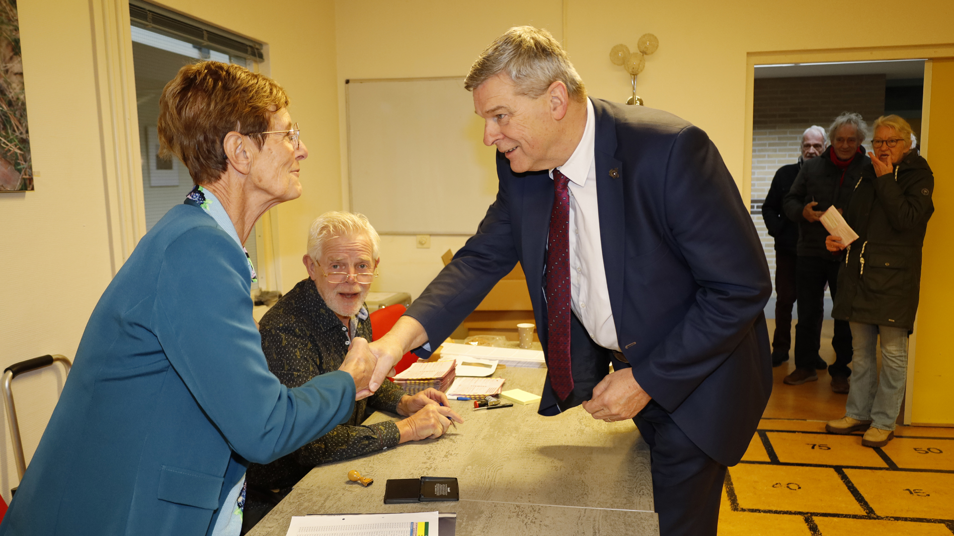 DAMWÂLD – Burgemeester Klaas Agricola stemde woensdagochtend in het gemeentehuis te Damwâld. Ook bezocht hij andere stembureaus in zijn gemeente en trakteerde de medewerkers op gebak.