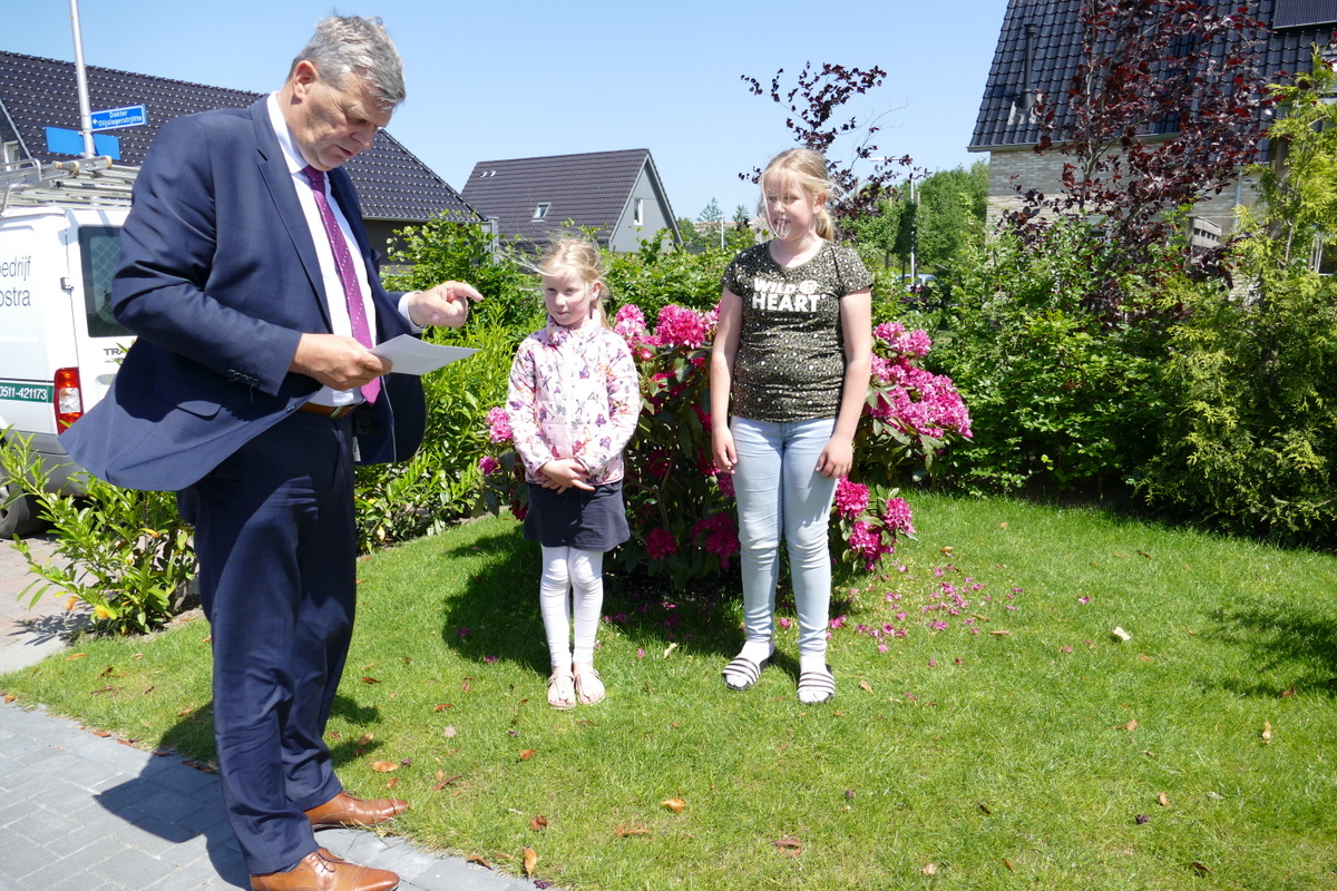 Burgemeester Klaas Agricola van de gemeente Dantumadiel kwam persoonlijk bij de winnaars thuis om hen te feliciteren en een presentje aan te bieden.