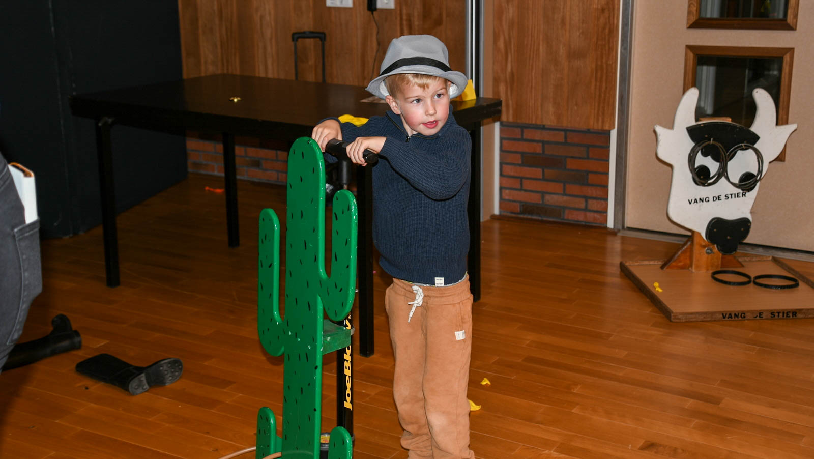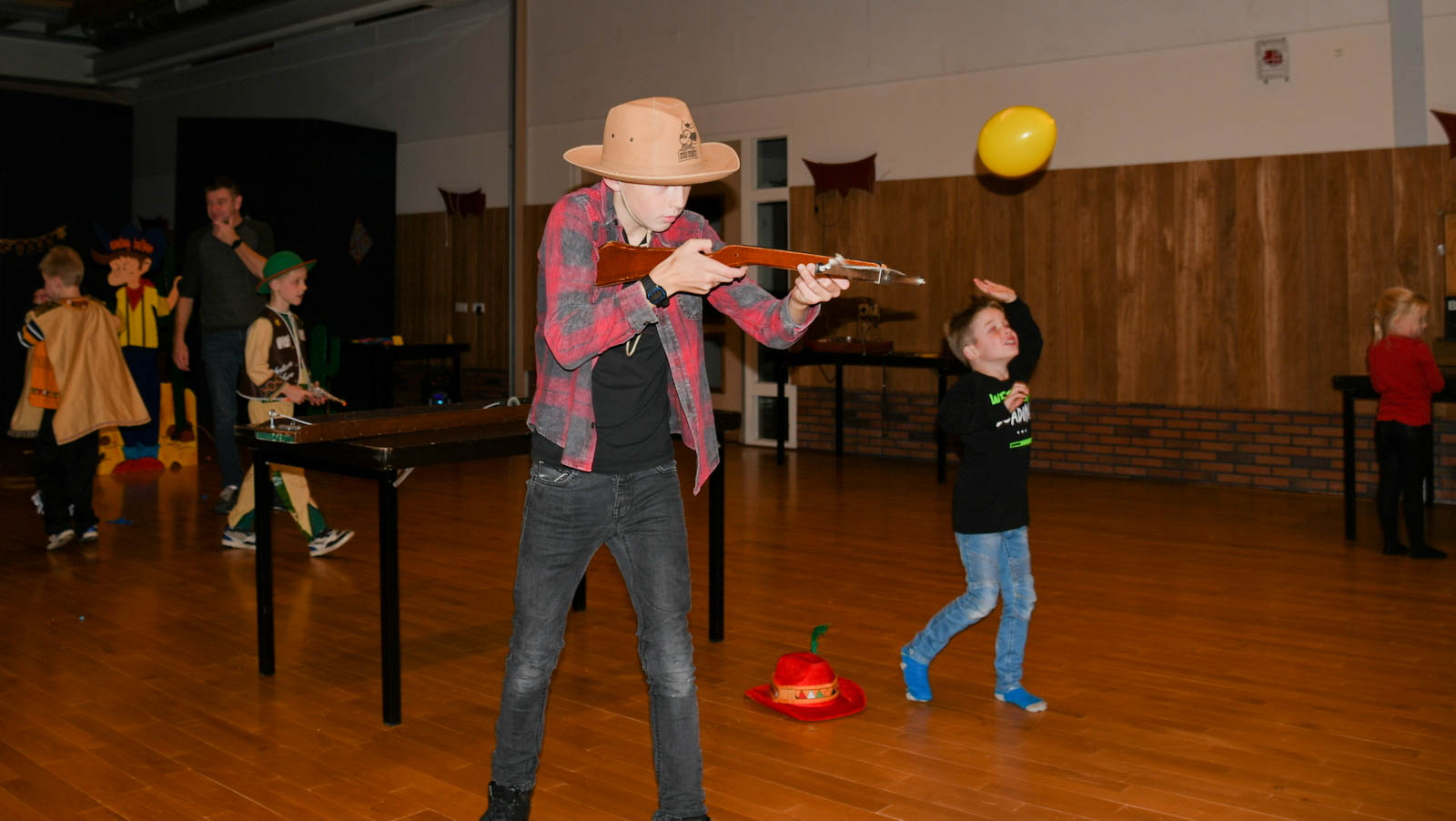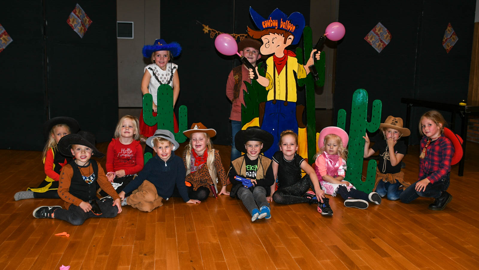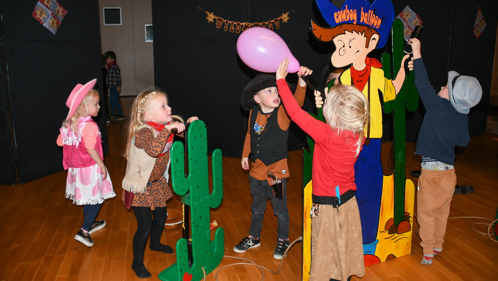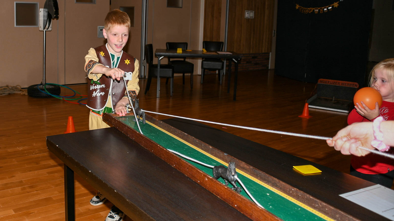 In de grote zaal konden ze de volgende spelletjes doen: lassowerpen, de spiraal, bull shot, paardenrenspel, wielschieten, hoefijzerwerpen, vang de stier. Erg in trek was het ballonnen opblazen bij de Cowboy balloon. Tussendoor kregen de kinderen traktaties.