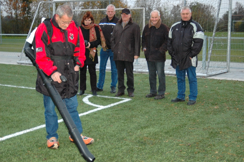 De gemeente Dantumadiel heeft de voetbalvereniging daarom een bladblazer met bijbehorende veiligheidsmaterialen en een tank benzine geschonken. Op deze manier kunnen de vrijwilligers het veld weer in optimale speelconditie brengen. Wethouder Marianne Hofs overhandigde de bladblazer op maandagmiddag 8 november aan een delegatie van VV Zwaagwesteinde. De bladeren moesten er daarna meteen aan geloven toen de aanwezige bestuursleden de nieuwe machine uitprobeerden.
