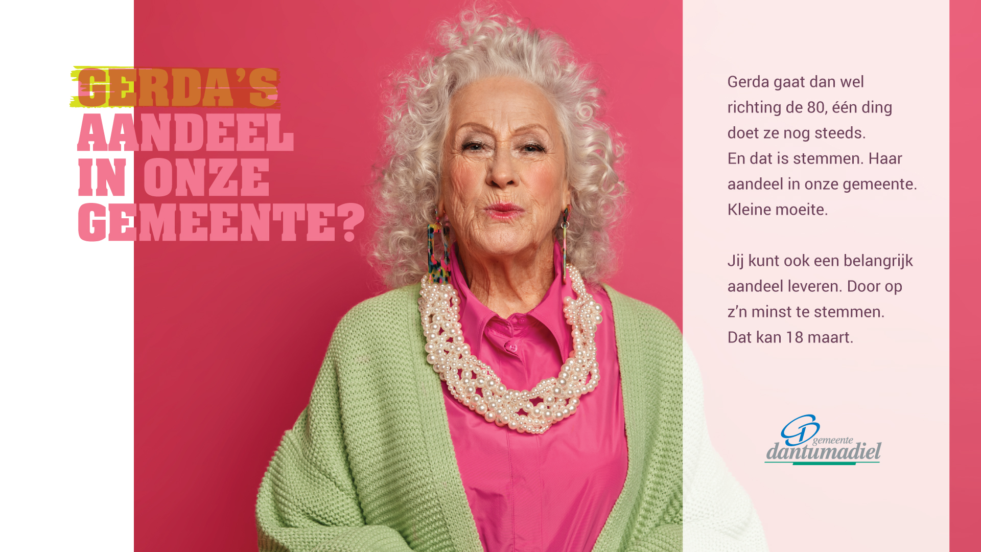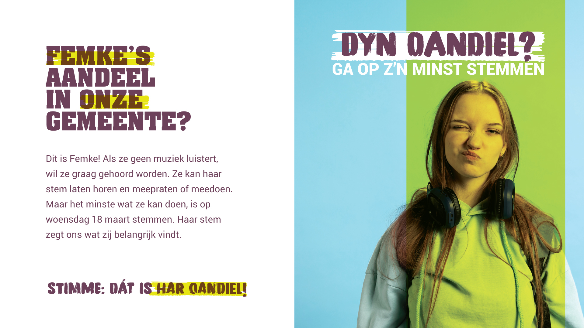 De campagne is politiek neutraal en een oproep aan de inwoners van Dantumadiel om gebruik te maken van hun stemrecht. “Met dyn oandiel maken we het klein en dichtbij. Je hoeft geen politiek expert te zijn. Met je stem laat je zien wat jij belangrijk vindt. Dat is jouw aandeel in Dantumadiel.” Eén van de gezichten van de campagne is Femke. Politiek vindt ze ver weg en saai. Toch heeft ook zij een aandeel. Alleen al door te stemmen zegt Jonker. “Niet meer, niet minder. Femke staat symbool voor veel mensen”, vindt Jonker. “Je hoeft het niet overal over eens te zijn of alles te volgen. Maar met je stem laat je zien wat jij belangrijk vindt. Dat is jouw oandiel.”
