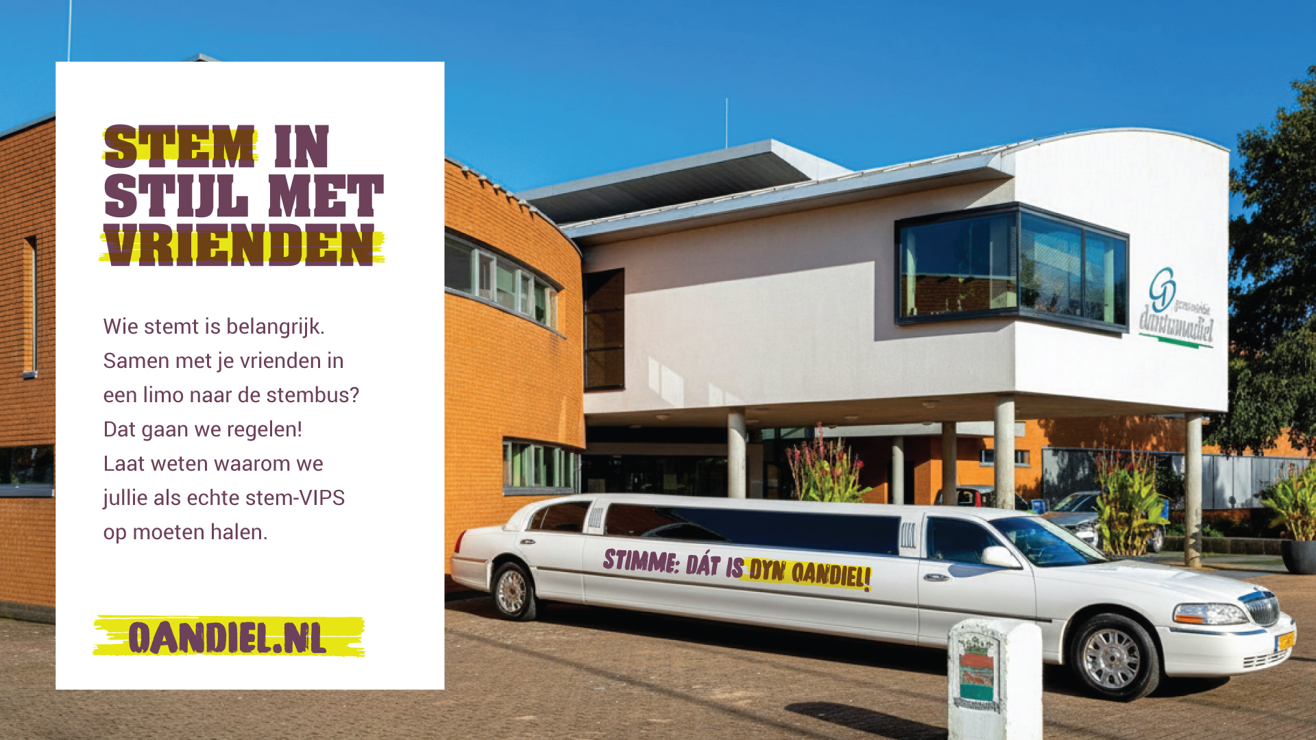 Opvallend onderdeel van de campagne is de VIP-stemactie. Inwoners van alle leeftijden kunnen zich binnenkort aanmelden om als ware VIP te gaan stemmen. Ze worden samen met vrienden of bekenden opgehaald in een limousine en naar het dichtstbijzijnde stembureau gebracht. Volgens Margreet Jonker maakt dat stemmen tot een unieke ervaring, niet als verplicht nummer. “Als een limo helpt om mensen in beweging te krijgen, dan doen we dat. Het doel is serieus, de vorm mag licht zijn. En wie wil dat nou niet, naar de stembus in een limo?”