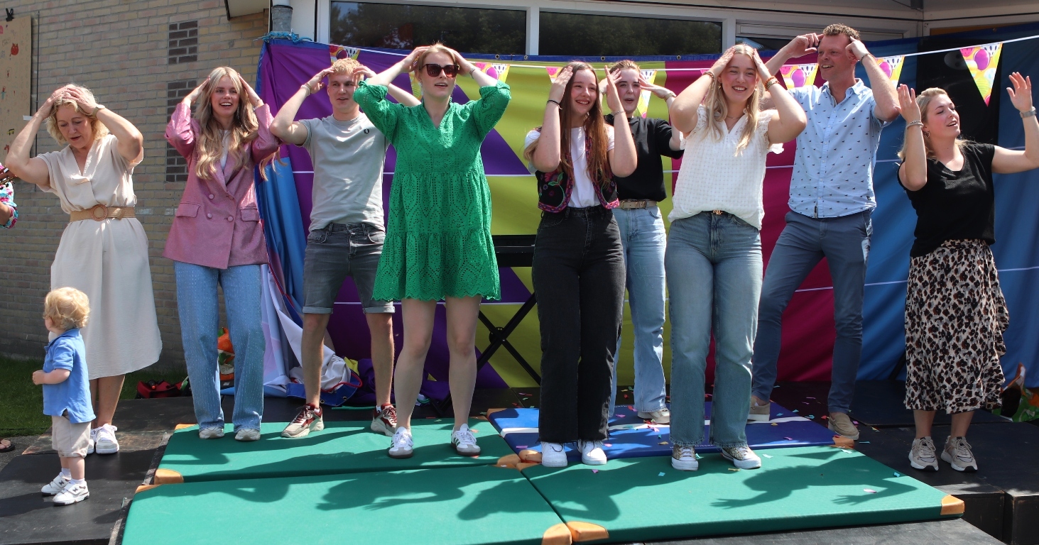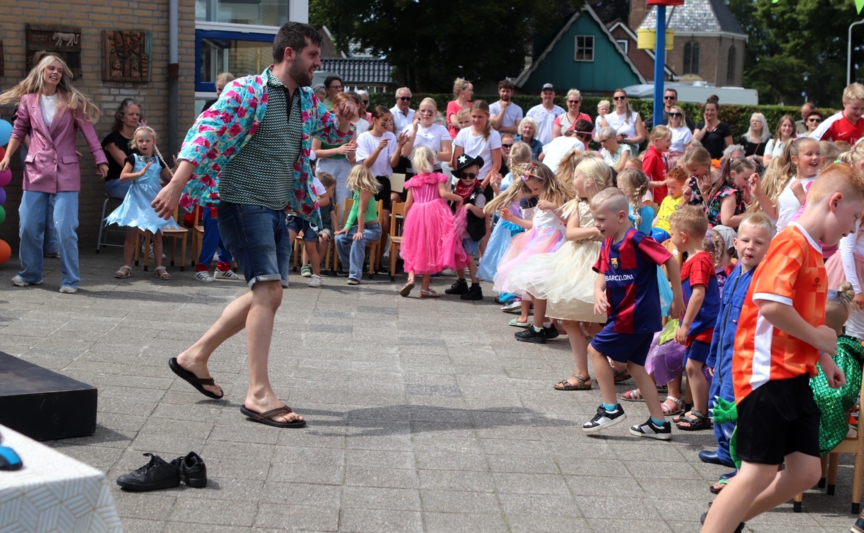 SURHUIZUM – Na het feestelijk optreden van de leerlingen werd donderdag 18 juli het tijd voor de bekendmaking van de nieuwe schoolnaam in Surhuizum. Cornelis Egberts Gayckema (Knilles Eiberts), beter bekend als de ‘Balkespringer fa Surhuzum’ (Juf Bonnie) samen met Jelle Boerema, wethouder van de gemeente Achtkarsplen werd de nieuwe naam onthuld: KBS ‘De Balkespringer’.