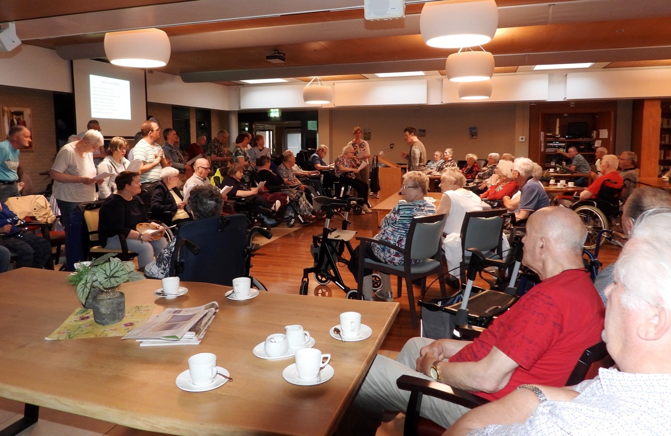 KOLLUM – Na drie jaar werd er Woensdagavond 18 mei weer opgetreden door de zanggroep de Blide Sjongers in Meckama State te Kollum, De Blide Sjongers is een koor voor mensen met een verstandelijke beperking en telt 33 leden het koor speelt en zingt uit hun hart en uit enthousiasme onder leiding van enthousiaste vrijwilligers.
