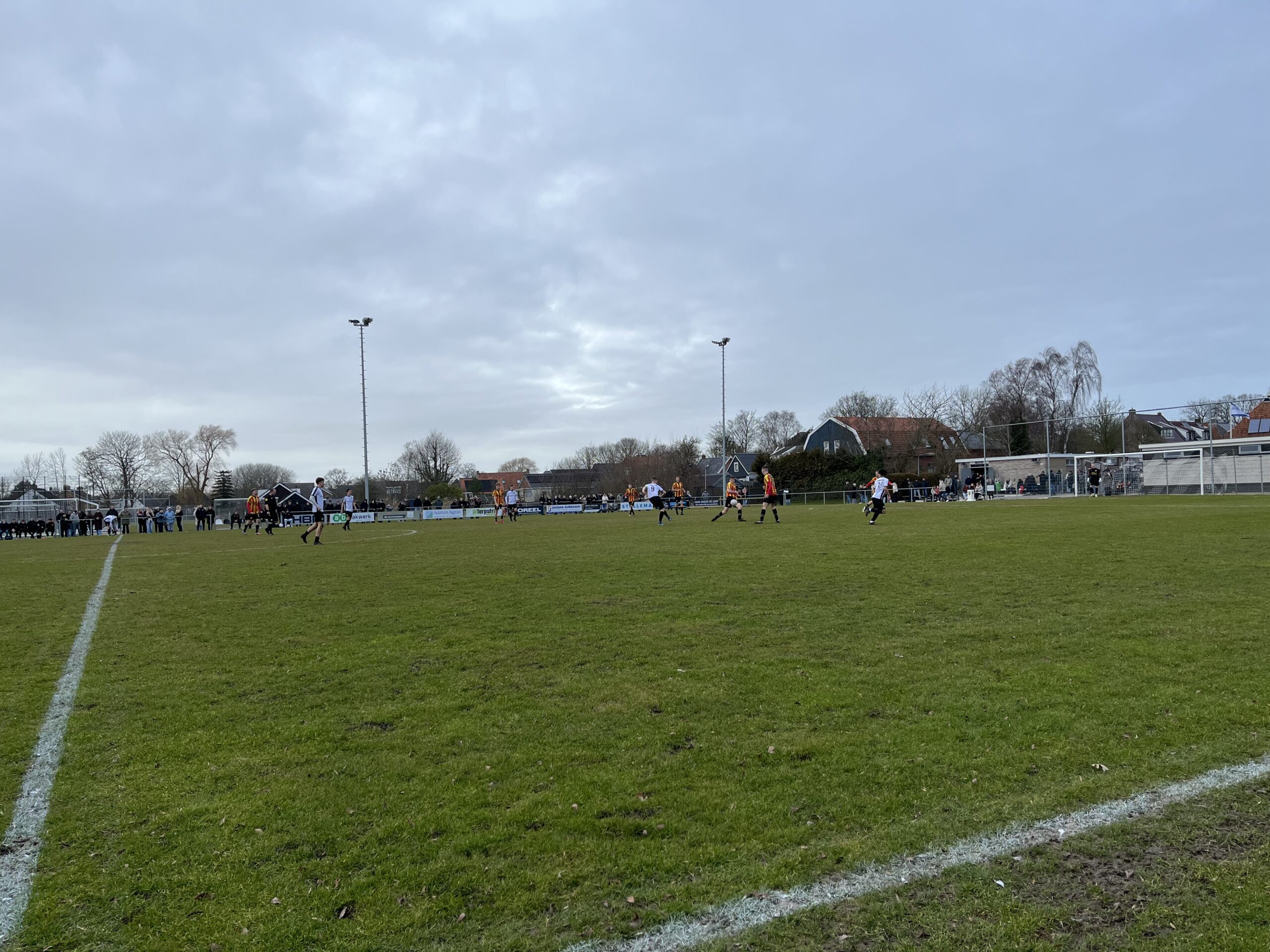 MARRUM – Het was eindelijk zover: de derby tegen Wykels Hallum kon doorgaan. Onder prima omstandigheden en met veel publiek langs de lijn stond er vanaf de aftrap meteen spanning op het duel. Marrum begon scherp en kreeg al binnen dertig seconden een enorme kans. Na een uitstekende bal van Hedser Boersma stond Cornelis Bolding oog in oog met de keeper, maar hij maaide ongelukkig over de bal heen. Een droomstart bleef zo uit, maar het zette wel direct de toon.
