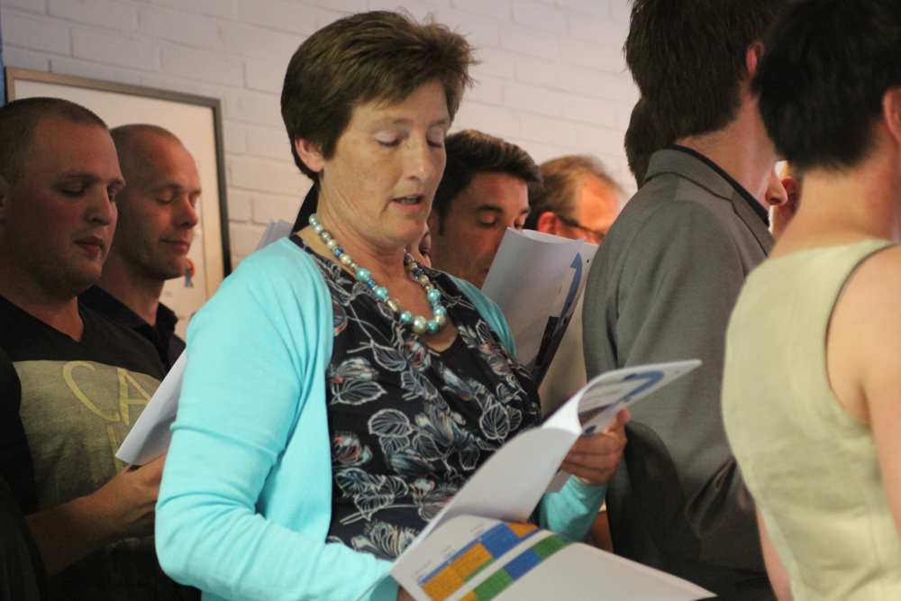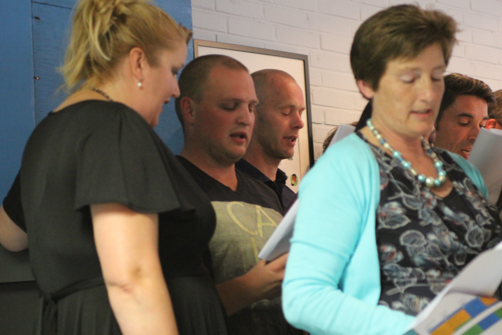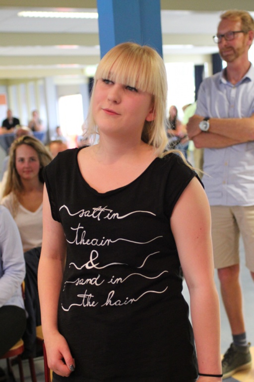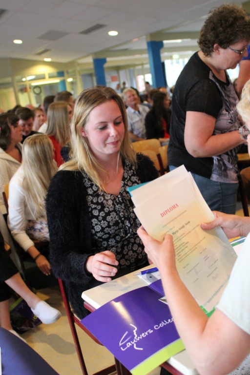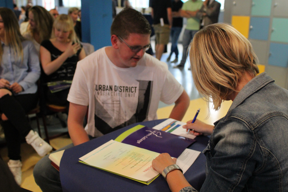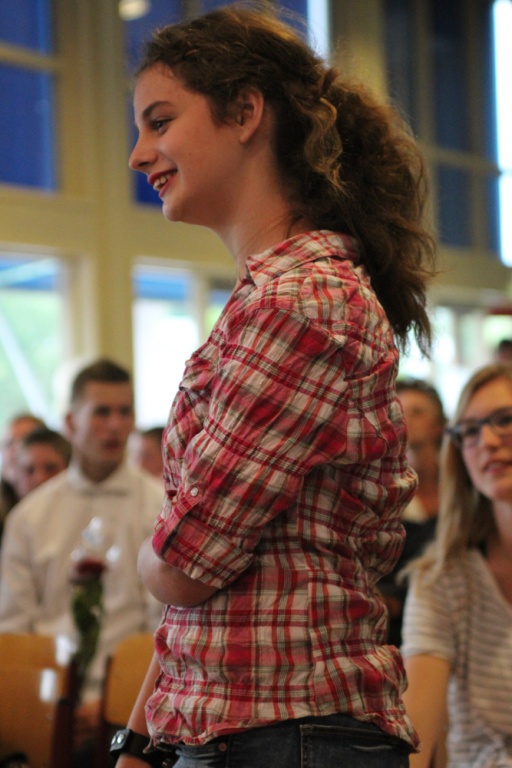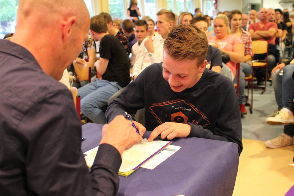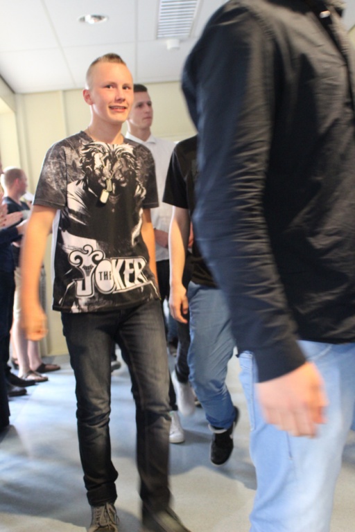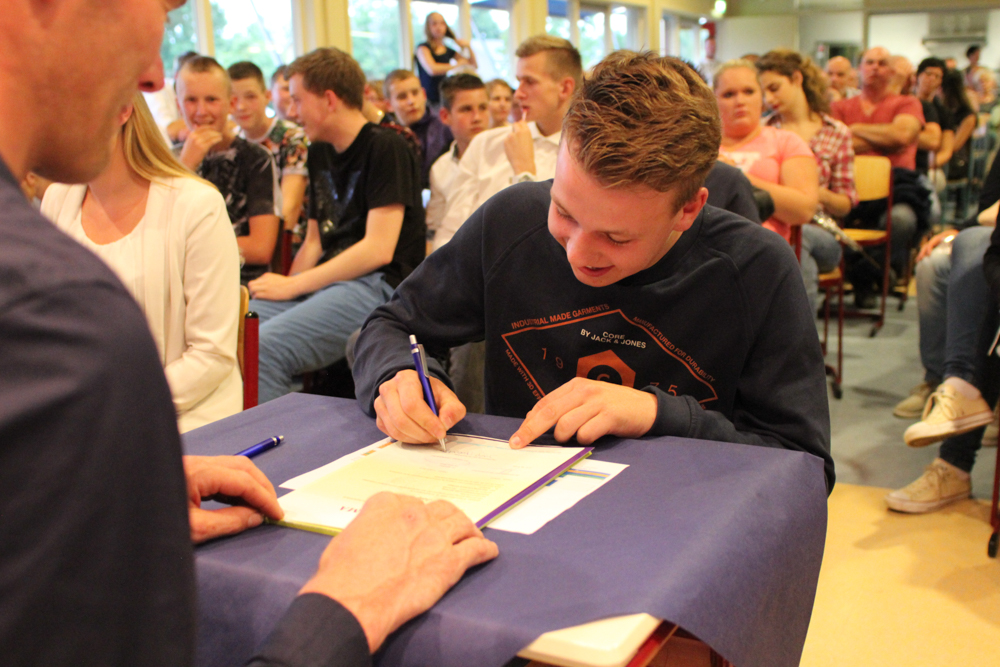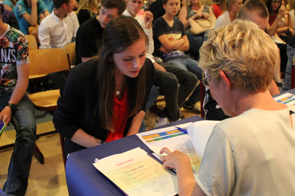 Eerst werden de geslaagden in de mediatheek gehouden. Ze kwamen binnen, op het lied ”We Are The Champions”. Steeds moesten 7 leerlingen naar voren komen. Eerst werd er iets leuks over ze verteld in de vorm van een gedicht door een docent. Daarna volgde het echte werk; het tekenen van het welverdiende diploma. Ze kregen een roosje mee, evenals een goodiebag. Ook werden alle namen van de leerlingen verwerkt in een lied, gezonden door de docenten.