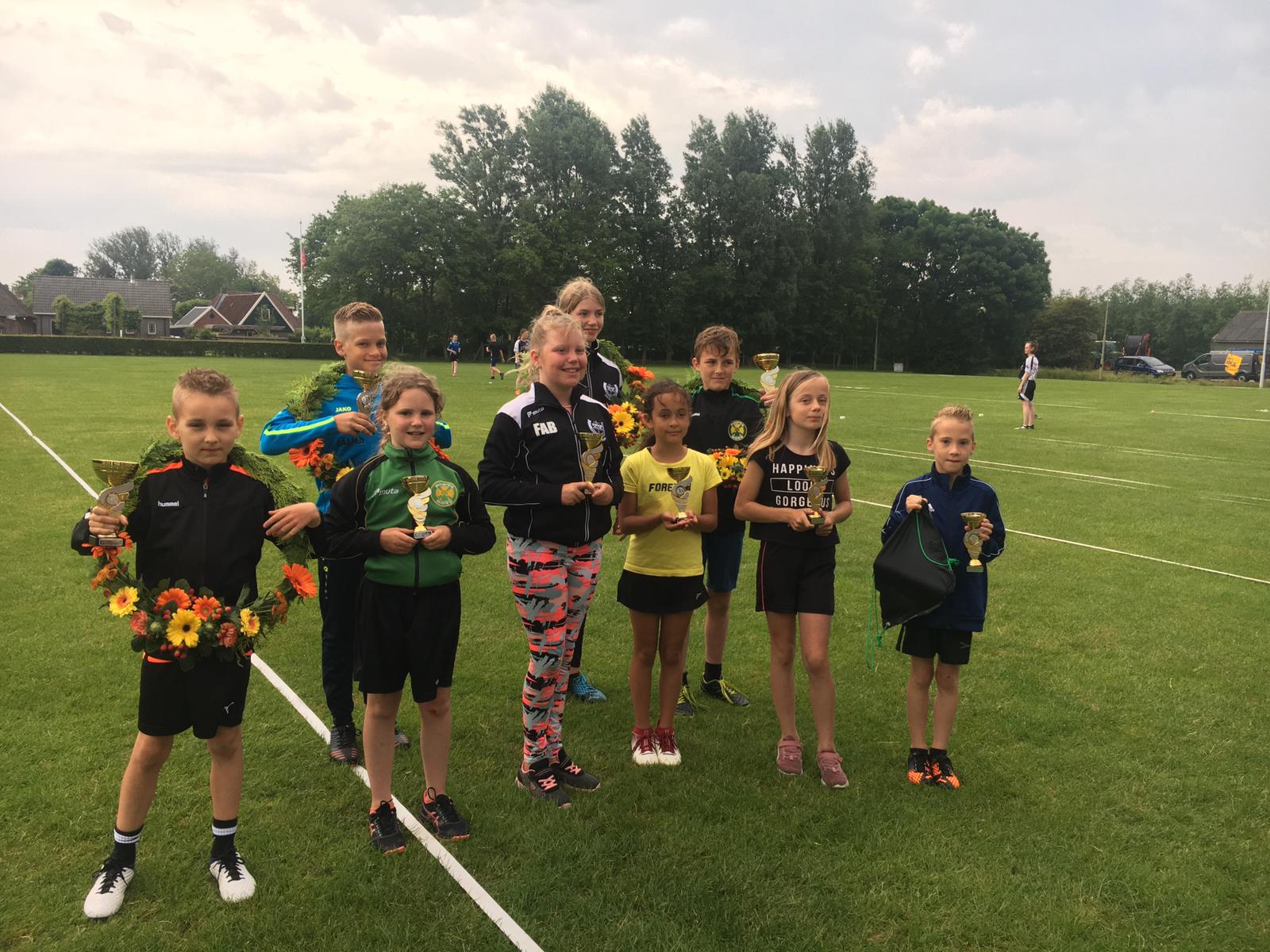 Bij de kabouters waren er 6 kaatsers, die ieder voor zichzelf kaatsten. Er waren 3 partijen waarin deze kaatsers door elkaar werden geloot. Als scheidsrechter moet je hier altijd heel goed opletten, want hier wordt vlot gekaatst. Jorn Faber had al zijn 3 partijen gewonnen en mocht met de krans naar huis. Bram de Weger werd 2e en Marieke vd Glint 3e. Voor alle drie was er een mooie beker voor in de prijzenkast thuis. Bij de welpen/pupillen waren er 4 parturen en werd er in poule verband gekaatst. Hier werd sportief gekaatst, met zo nu en dan wat hulp en uitleg van de scheidsrechters.