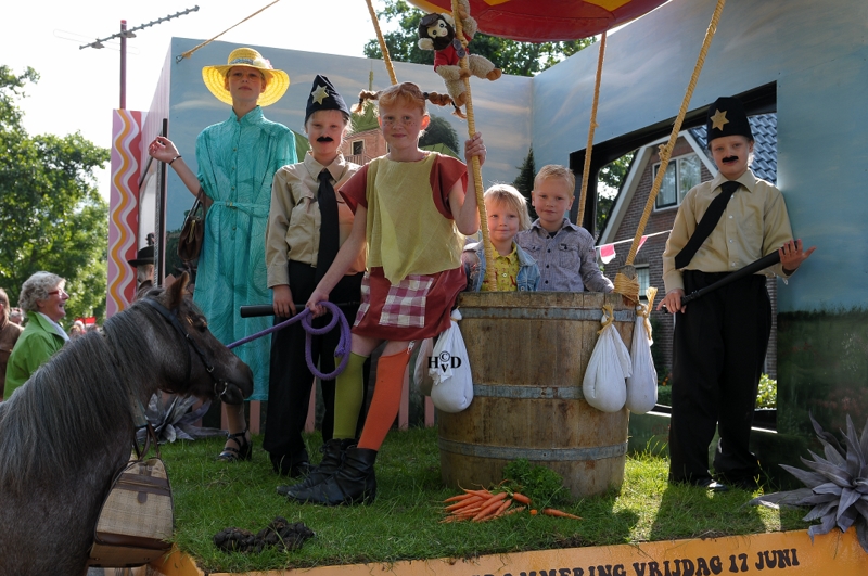 Vrijdagmorgen om 9.30 uur was er een optocht met versierde wagens van deze drie dorpen. Een veertiental wagens, vrije ontwerpen en fietsen deden hieraan mee. Een bont geheel aan kleuren kwam langs. Het thema was terug naar de jaren zestig.