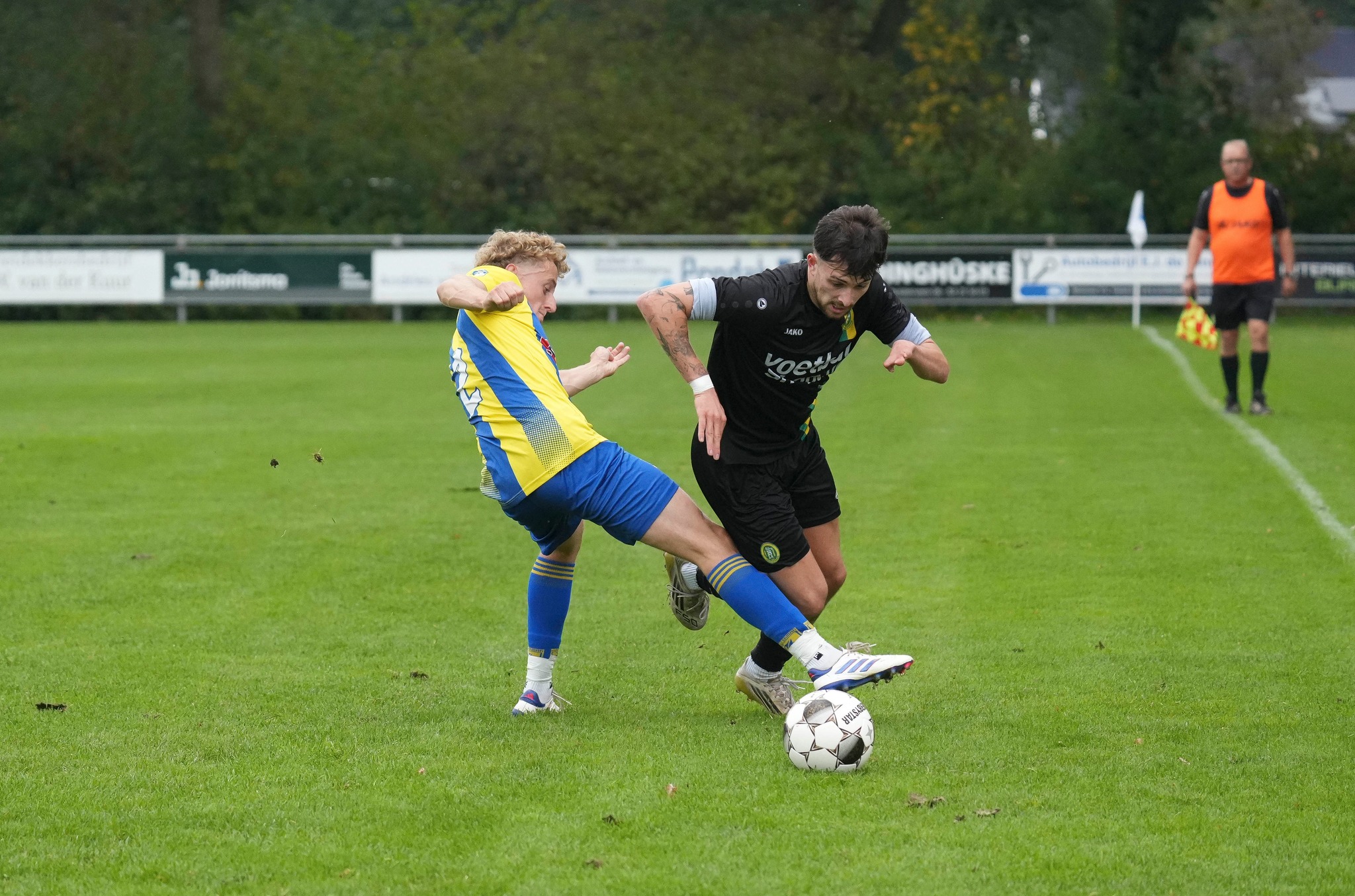 Meermaals claimt Harkema tevergeefs een strafschop, waarbij het zeker bij een even duidelijk zichtbare als hoorbare charge op Ids van der Ploeg in het vijandelijke strafschopgebied verbazing wekt dat het fluitsignaal uitblijft. Als dat na 81 minuten opnieuw het geval is wanneer Wytse Couperus hardhandig ondersteboven wordt gelopen is dit voor Aize Storm het sein om seconden later Willem Veenstra naar de vlakte te werken, een actie die de rode kaart als resultaat heeft. De sfeer binnen de lijnen is dan afgezakt naar het niveau ‘grimmig’, een blik langs de zijlijn leert dat ook daar de onderlinge verstandhouding zodanig van aard is dat er tussen de beide supporterskampen binnenkort onderling geen kerstkaarten verstuurd gaan worden. Arbiter Vree Egberts houdt het na beraad voor gezien. Een boeiend voetbalgevecht krijgt een vroegtijdig einde, een enerverende middag eindigt in mineur.