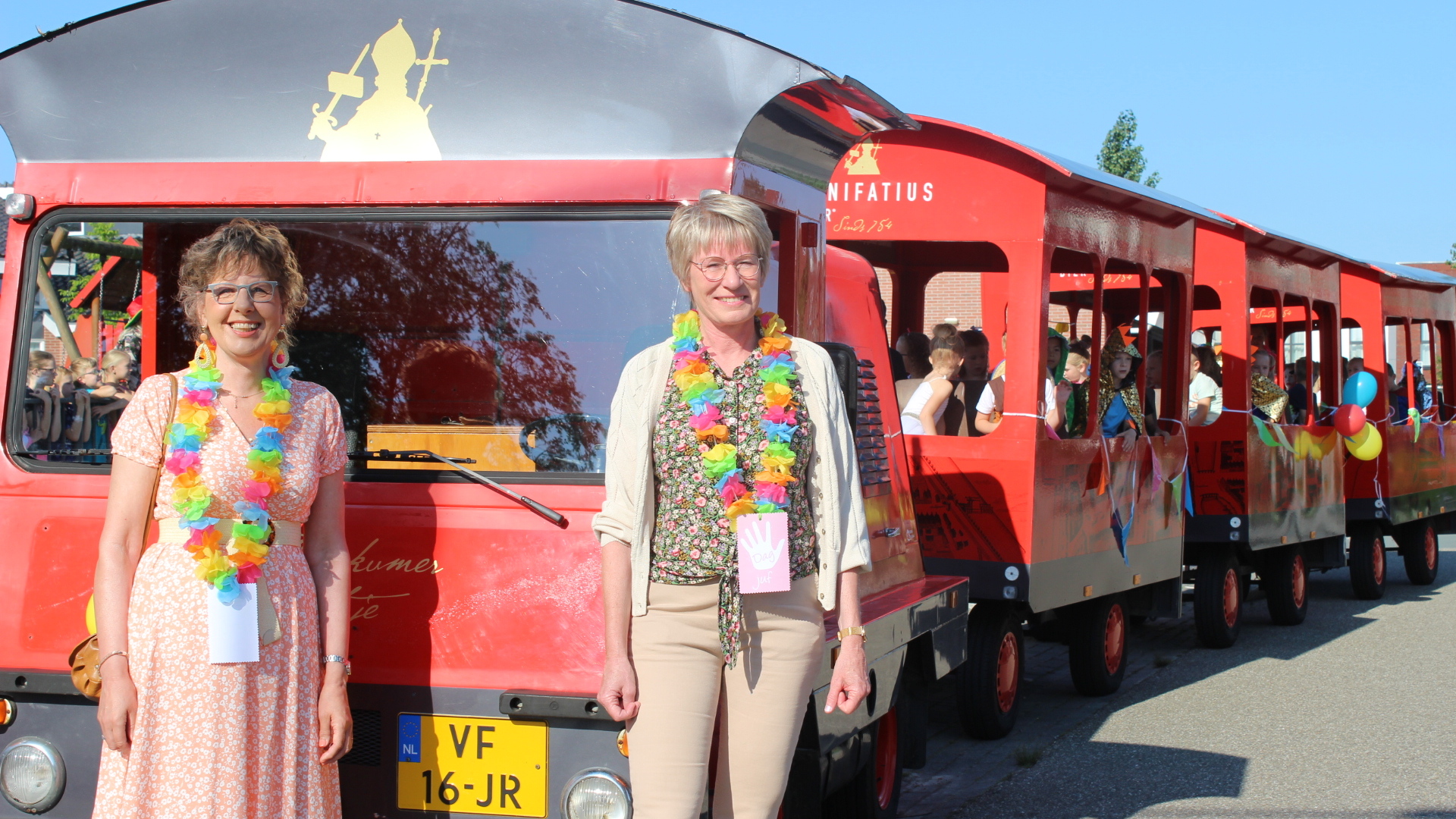 DOKKUM – Na beiden ruim 25 jaar werkzaam te zijn geweest in het basisonderwijs, hebben de kinderen en collega’s van cbs ‘Eben Haëzer’ in Dokkum donderdag 8 juli op feestelijke wijze afscheid genomen van juf Clarie Sytsma en juf Geertje van der Veen. Beide juffen hebben ’s ochtends samen met ‘hun’ kinderen van groep 2 een rondrit gemaakt door de Weeshuislanden in het Dockumer Lokaeltje.