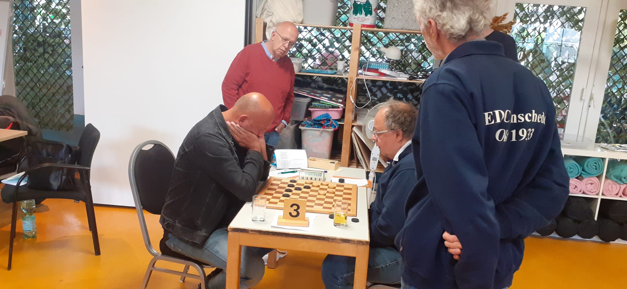 Binne Brouwer probeerde van alles, maar kreeg maar geen grip op zijn partij. Remise bleek uiteindelijk het maximaal haalbare. Arend Dijkstra speelde een sterke partij. Zijn tegenstander moest in het eindspel zoeken naar de juiste variant om nog remise te kunnen halen. Toen deze variant op het bord kwam, kwamen beide spelers de puntendeling overeen. Arnold Wiegersma kon op het eerste bord lang in het spoor blijven bij de sterkste speler van Enschede. Uiteindelijk bleek het net onvoldoende om een punt mee te nemen naar Rinsumageast.