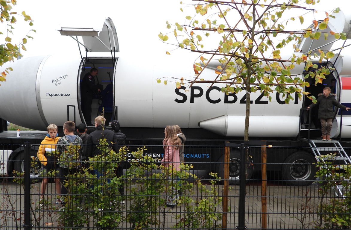 KOLLUM – Donderdagmiddag zijn de kinderen van groep 7 en 8 van de Professor Casimir uit Kollum op ruimtereis geweest! De Spacebuzz is niet alleen een raket, maar hoort ook bij een lesprogramma. Zo hebben de kinderen in de klas veel geleerd over de ruimte, bijvoorbeeld hoe je op de kop een koekje eet en de volgorde van de planeten.