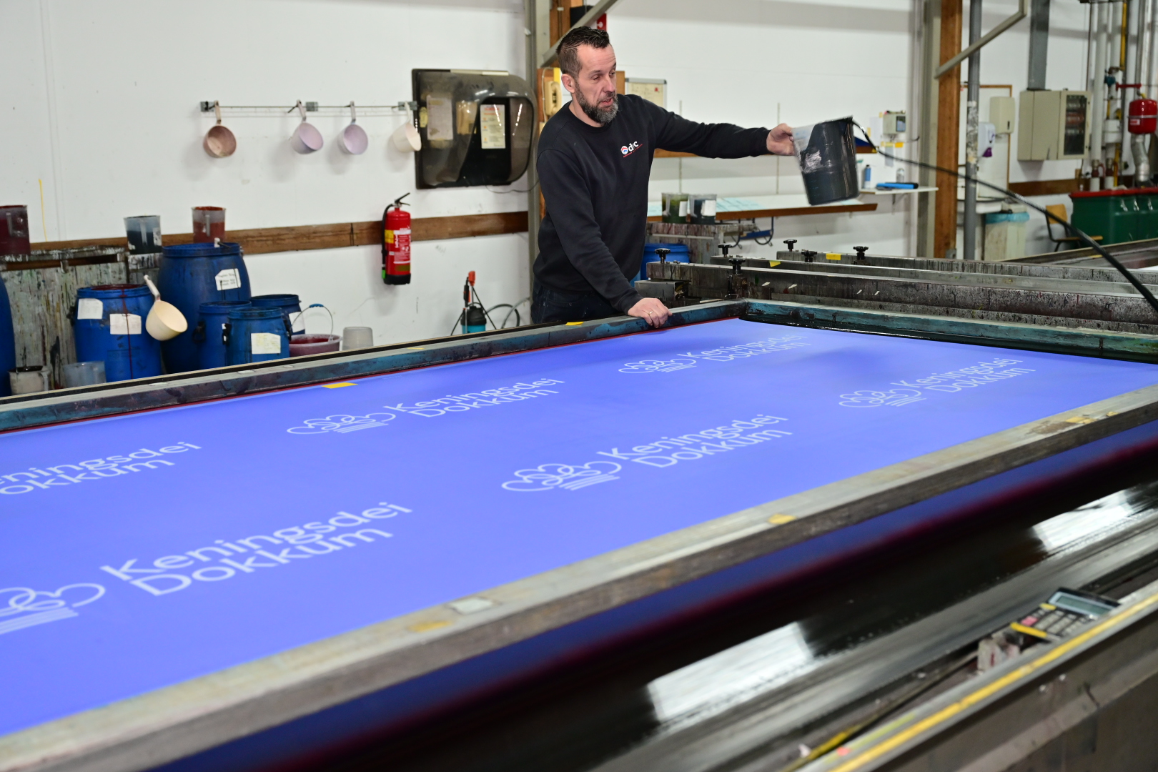 Johannes van Keimpema helpt mee met het drukken van de vlaggen: “Dit is hartstikke leuk om te dwaan. Wy fine it hiel moai dat wy dizze Keningsdei-flagge drukke meie.”