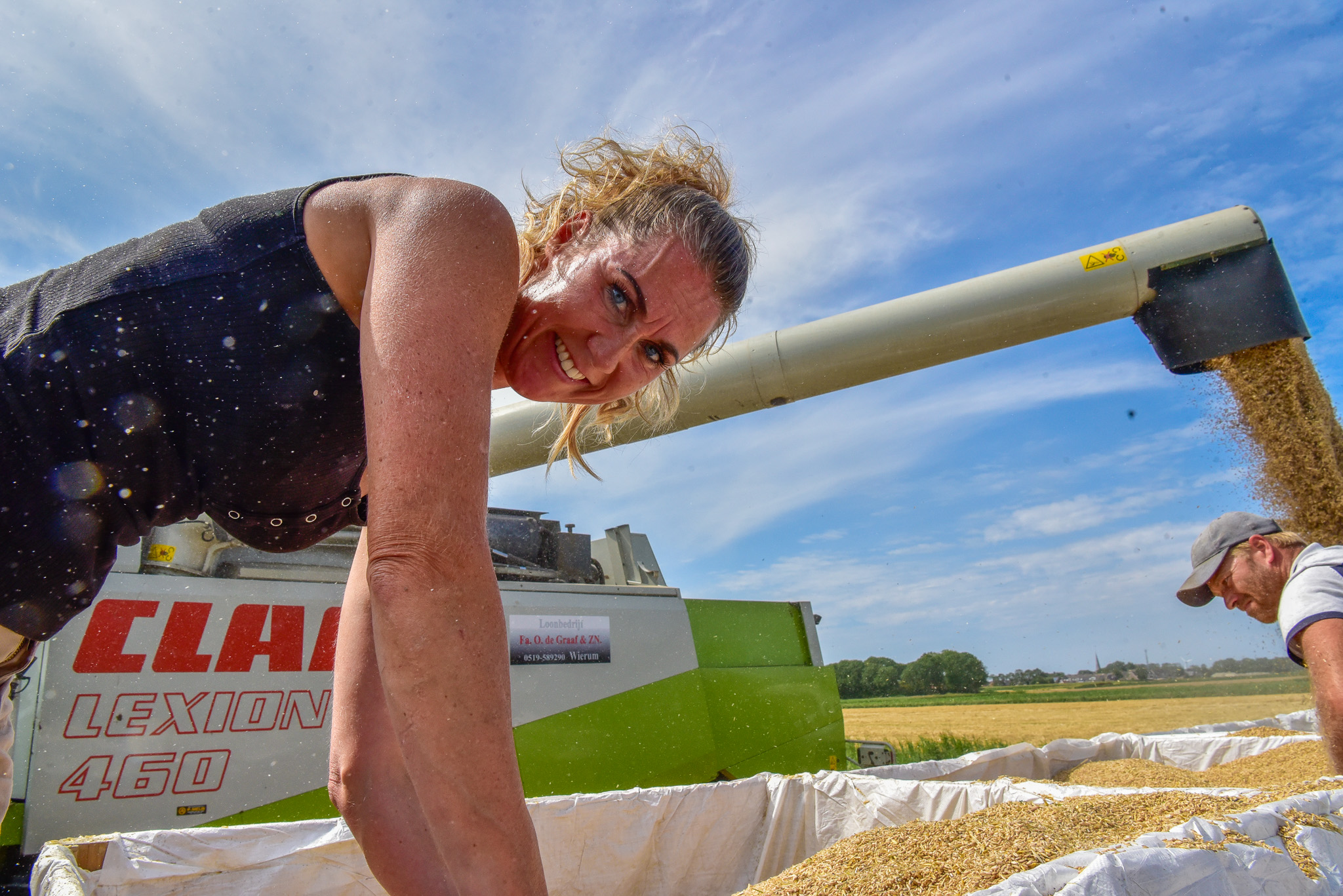 HOLWERT – De eerste naakte haver, die op 1 april gezaaid werd, is maandagmiddag geoogst. Volgens akkerbouwer Bianca van der Bos ziet de oogst er veelbelovend uit. Omdat het hier om een nieuw gewas gaat en het oogsten net iets anders verloopt dan bij andere gewassen, was het toch even spannend: “It is wol de fraach oft wy it goede momint útkeazen hawwe om te rispjen. Dus dan is it spannend wat der yn de kisten bedarret. Mar ik bin net ûntefreden.”